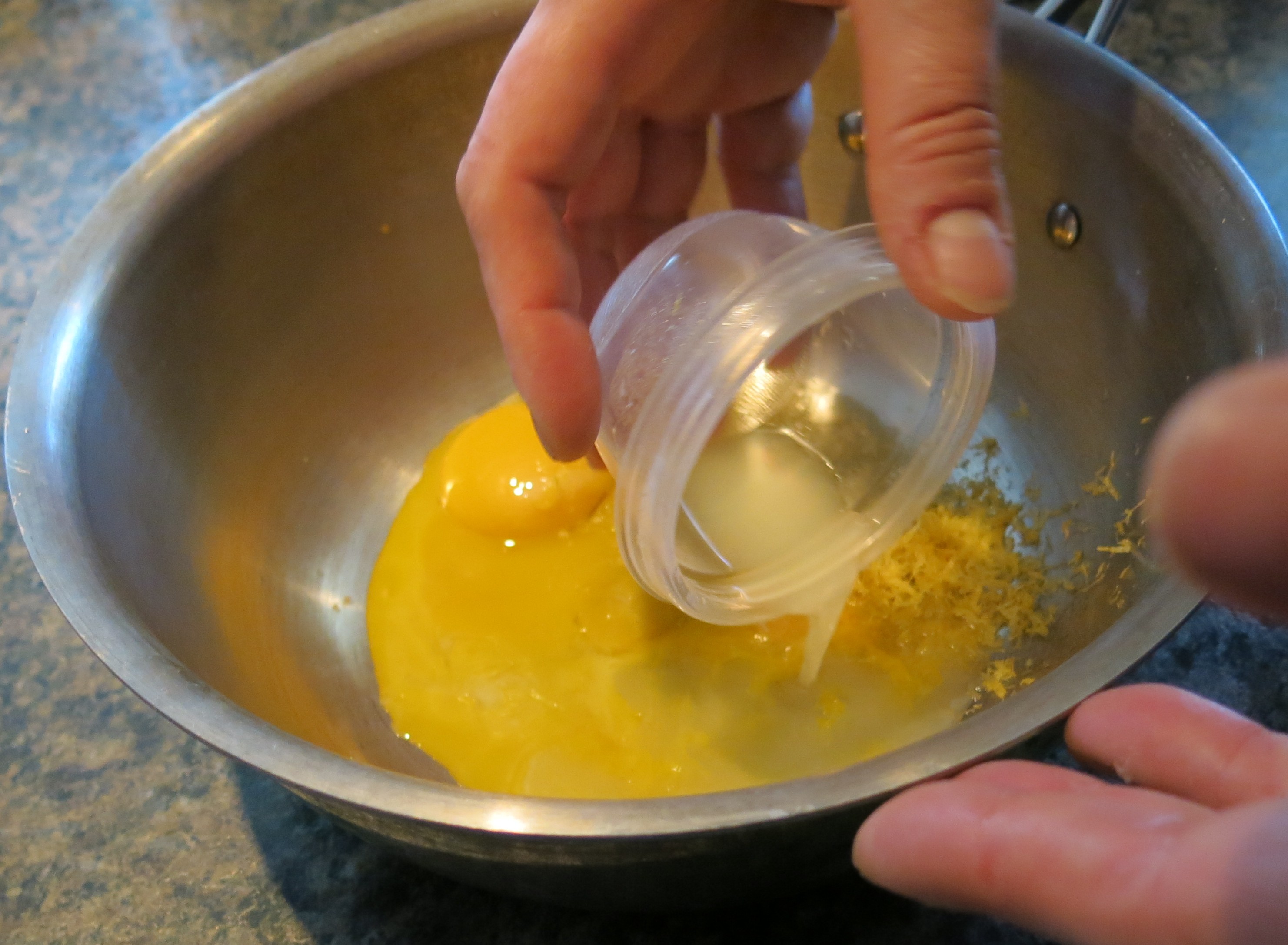 A couple of things to note. You are going to whisk, whisk, whisk until you want to drop to your knees and beg for mercy. Secondly, I use the direct-heat method. I put the pan right on the burner; I don’t like messing around with a double boiler and I just think it’s easier to learn to do this over direct-heat from the beginning (I explain this a bit more later). Thirdly, you need a pan with a heavy bottom. I talk about this later, too (see**). And finally, I add beaten egg whites at the end. I used to make the classic version, but we like the lightened, slightly more fluffy version better, but this is purely a personal choice…it’s entirely up to you. There will be more pictures than usual so you can see the progress better. Now to the recipe.