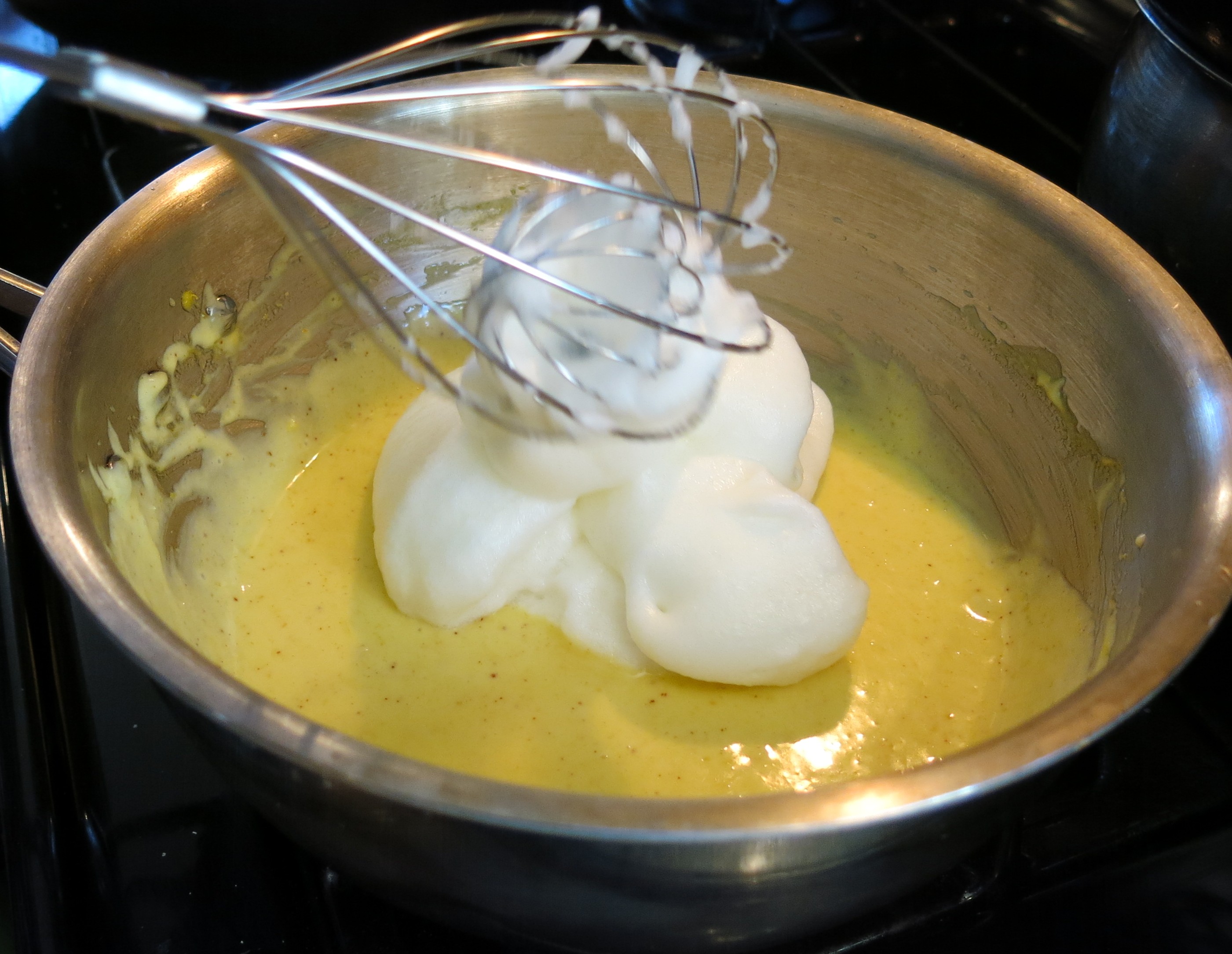 or I add the 2 reserved egg whites, that I have beaten to almost stiff peaks. Just whisk them in now.