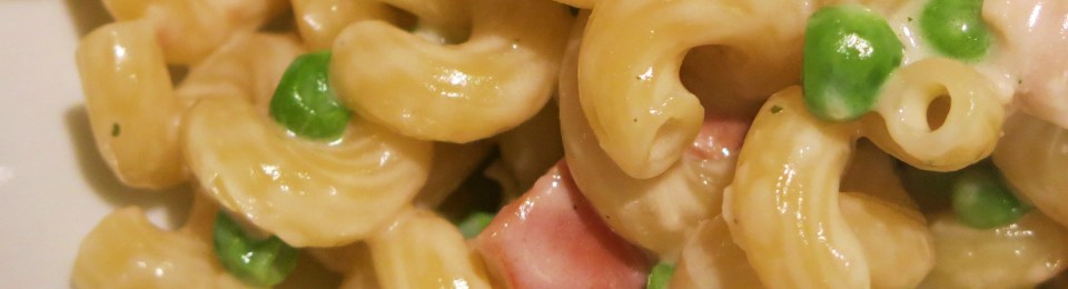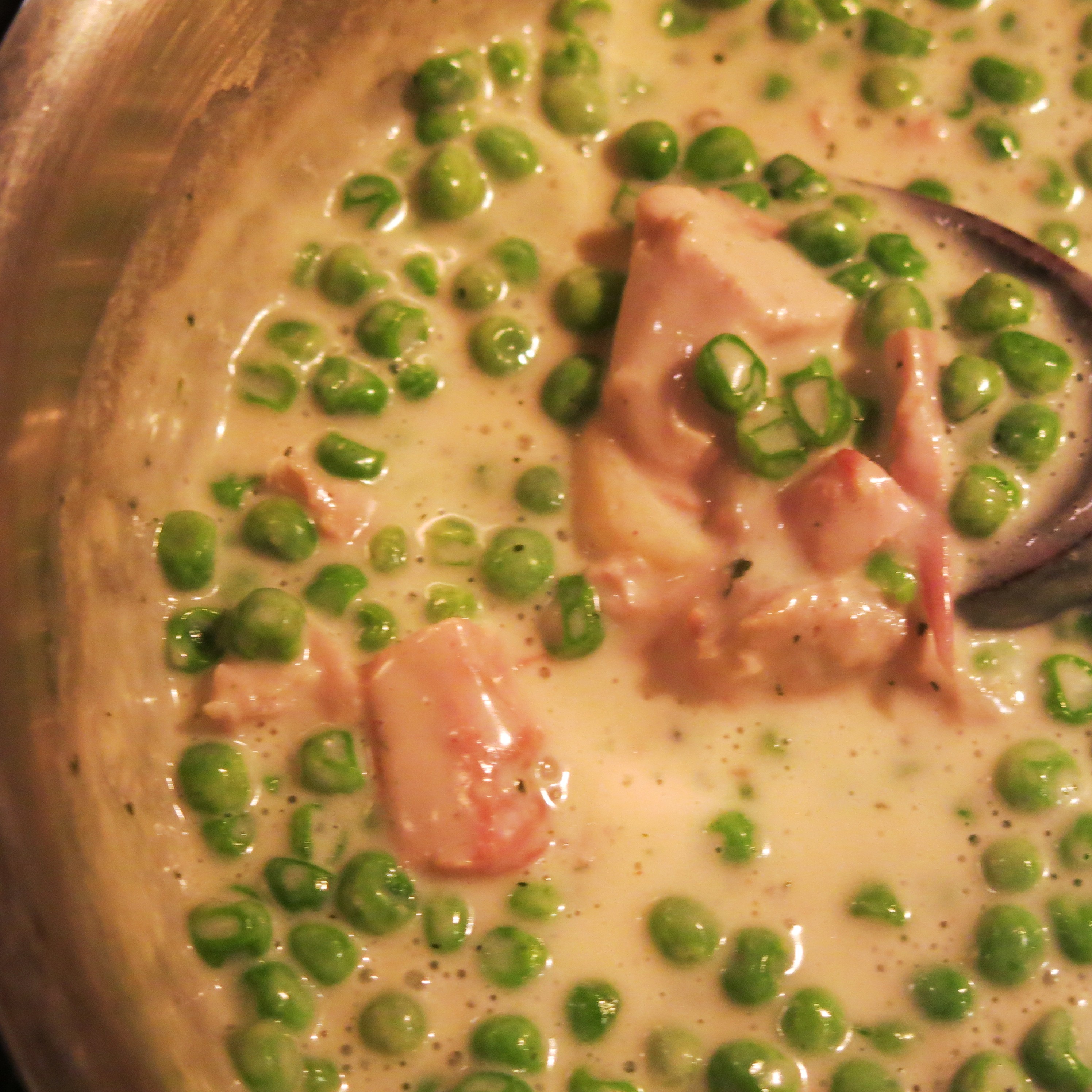 I stirred in chunks of the leftover turkey and some thawed, frozen peas. To thaw frozen peas, simply place the amount you’re going to use in a strainer and run under cold water until they thaw; it takes about 1 minute. Drain the peas well and add them to the sauce. Toss in a large pinch of salt (more than you might think–starches pull salt out of sauces. If you don’t add enough salt, the sauce will taste flat), several good grinds of black pepper and if your little heart desires some heat, a small amount of chile flakes.