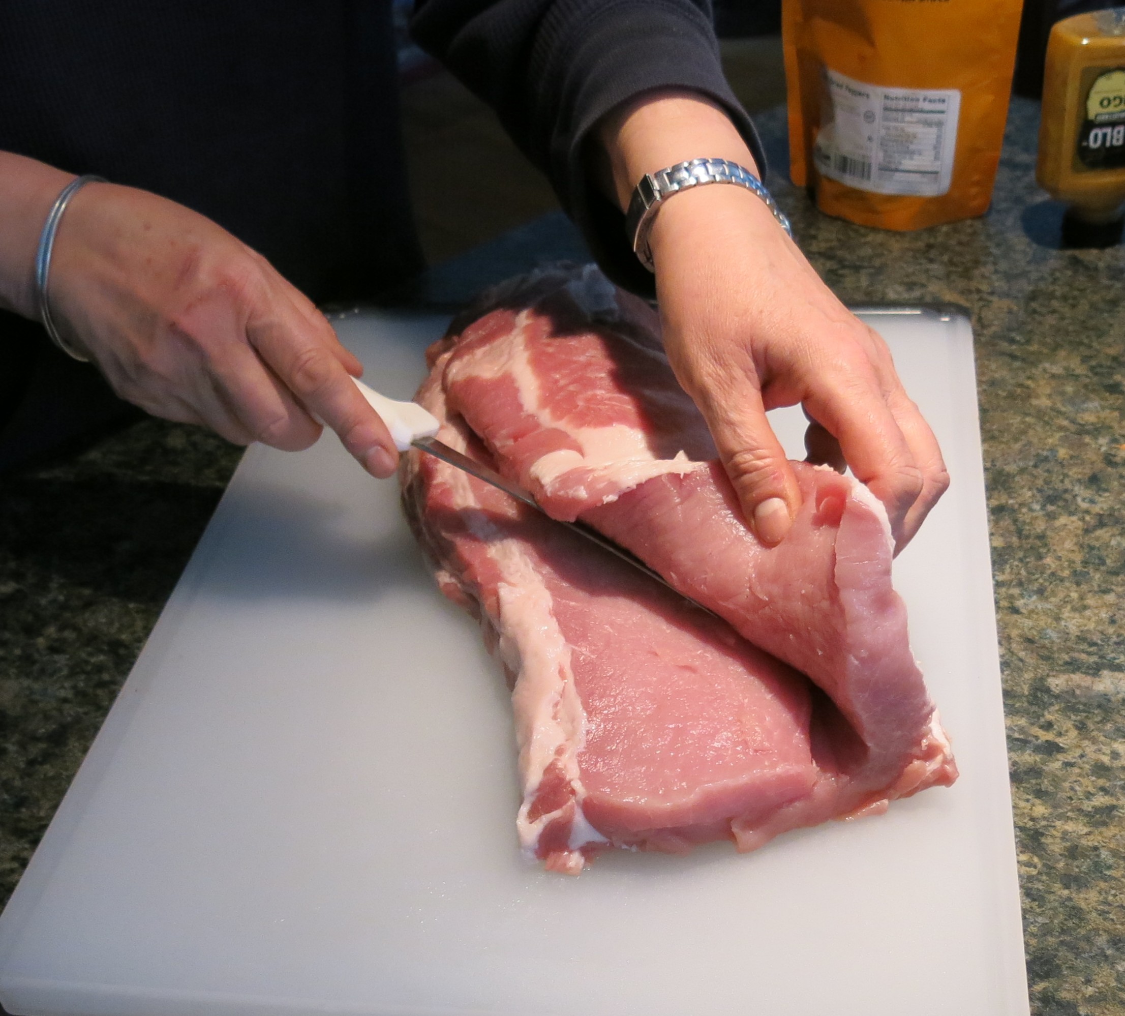 Keeping the knife more or less parallel to the cutting board cut 3/4 of the way through the meat, leaving the uncut edge (the edge away from where you began the cut) intact and about 1 inch thick. Think about how a book opens and think of the back part, the part you aren’t going to cut, as the spine of the book. Then open the flap you just cut out flat, like this: