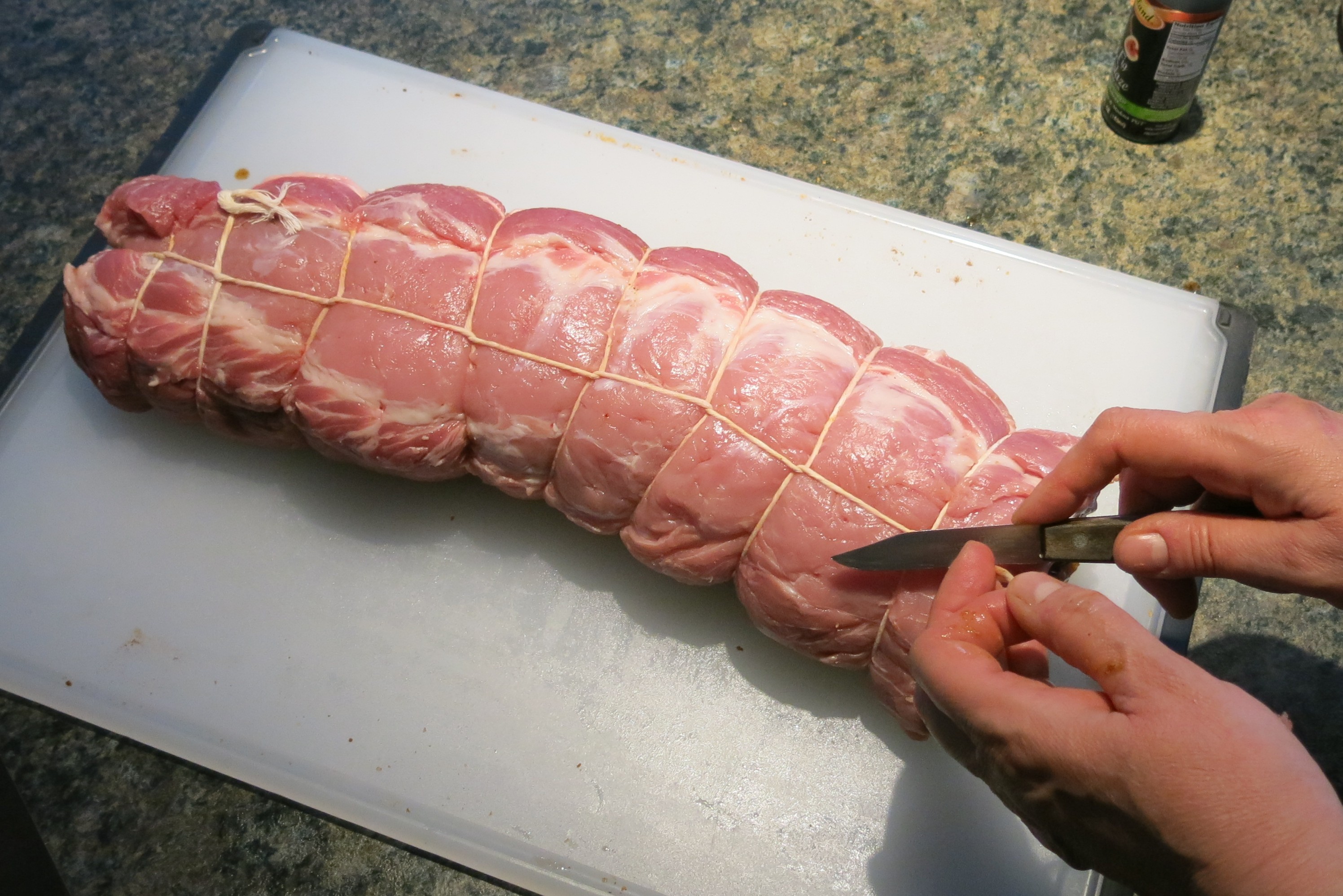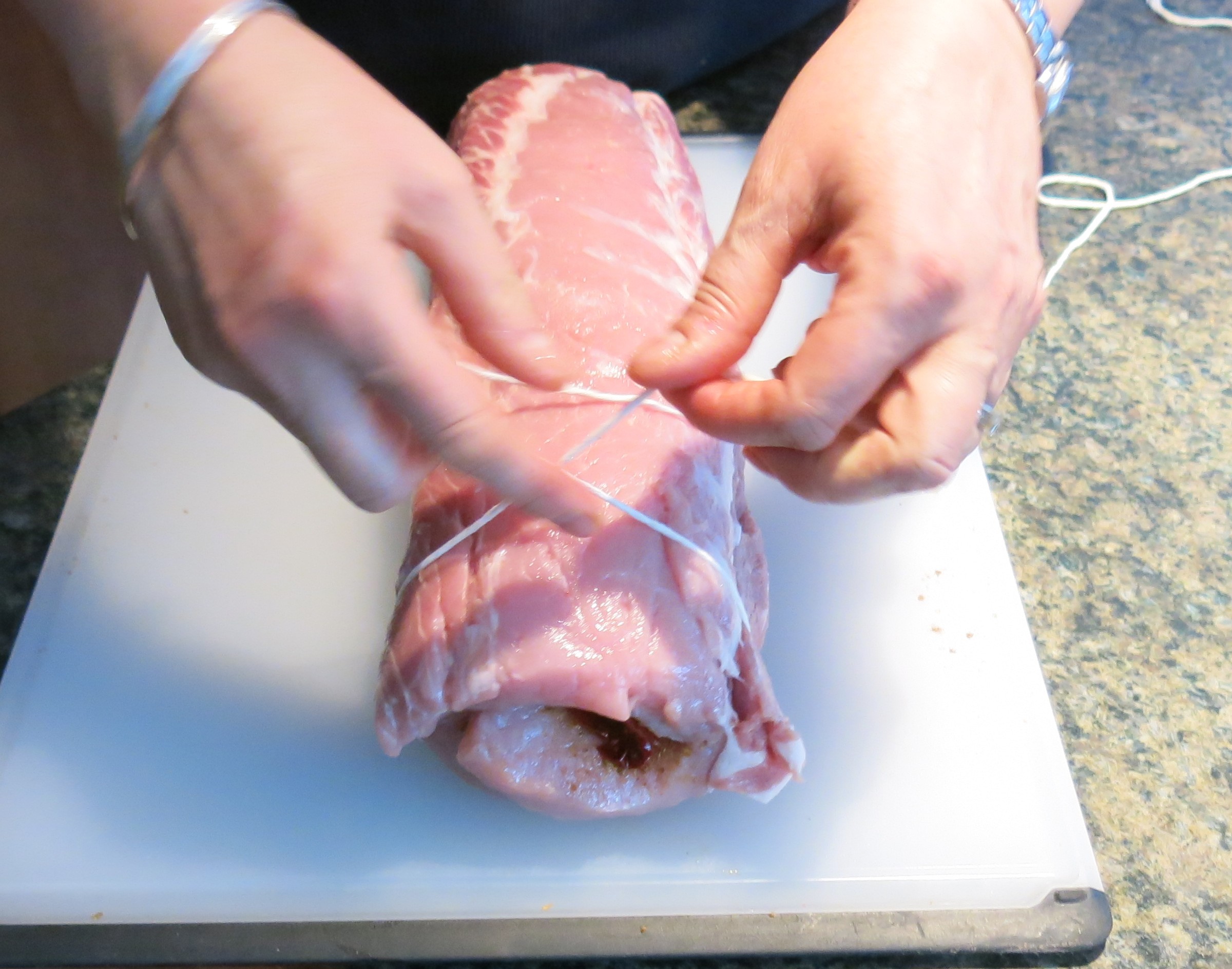 Keep slipping the kitchen twine under the meat, bringing it up and around and tying at about 2 inch intervals until you get to the end. You can see some of the fruit in the cut. Some people sew that opening closed, but I find tying to be easier. Use what method you’re comfortable with.