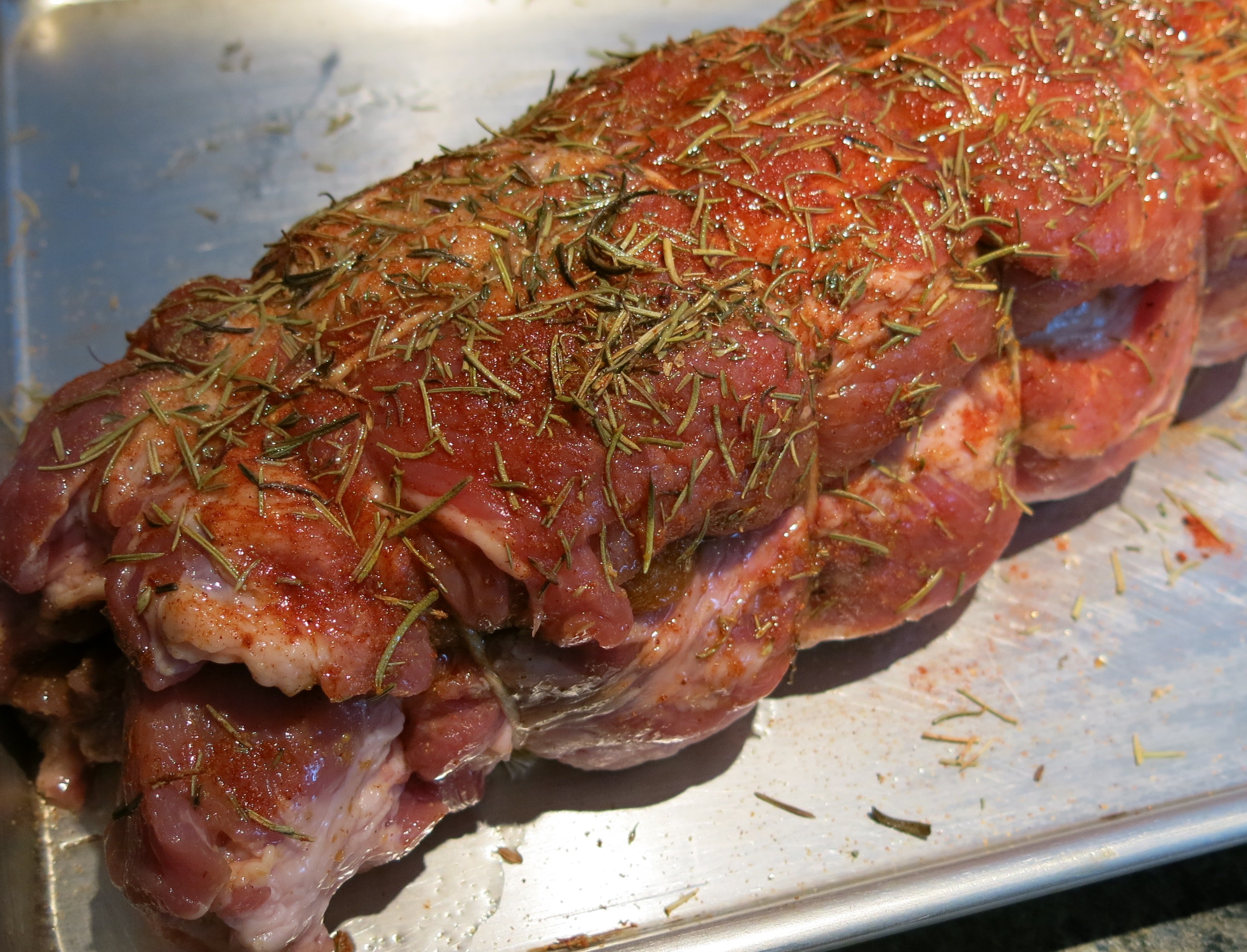 Now you’re ready to season the exterior. I drizzle some olive oil over the whole piece. This help it brown well and acts as a “glue” for the seasoning. I used rosemary, thyme leaves, roasted garlic granules, salt and pepper, and smoked sweet paprika.