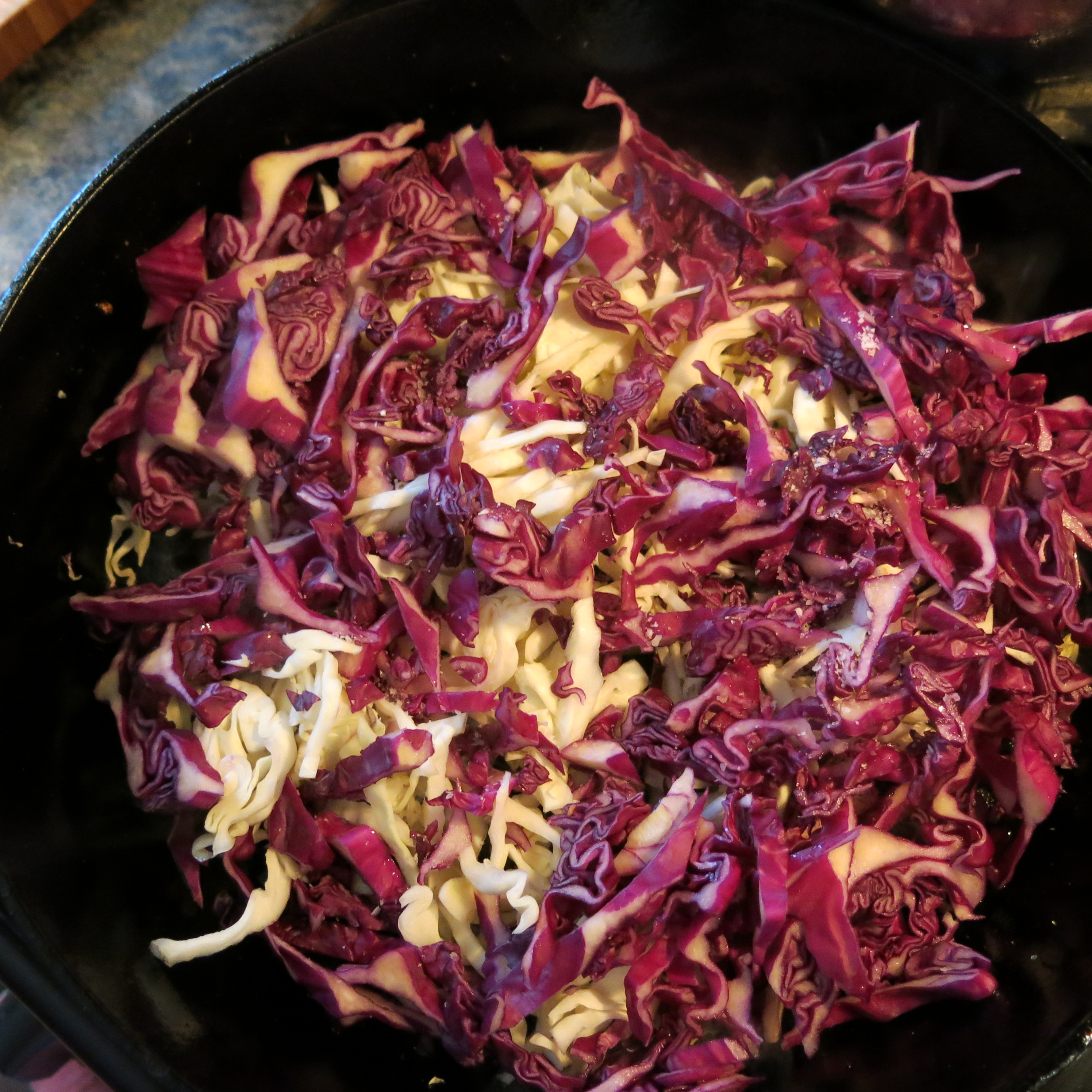 I’ve combined relatively coarsely sliced red and regular green cabbage here. I’m going to sauté this mixture in some pan drippings I had leftover from some pork burgers I fried in my cast iron skillet. You’ll see cast iron skillets in many of my pictures, as they are my go-to pans. Anyway, I introduced some “friends” to the cabbage