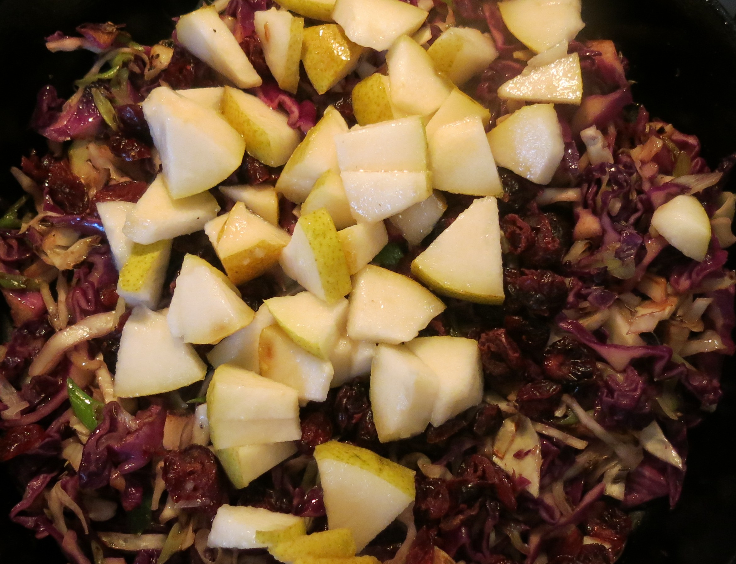 Continue to cook for a few minutes, then toss in a chopped fresh apple, or as I used here, an Anjou pear and dried cranberries. I left the skin on, but I usually peel an apple, as their skin is a bit too thick for my taste, but do what you want. Continue to sauté for another 3 or 4 minutes. You want the fruit to just begin to release their juices, but not to cook very much.