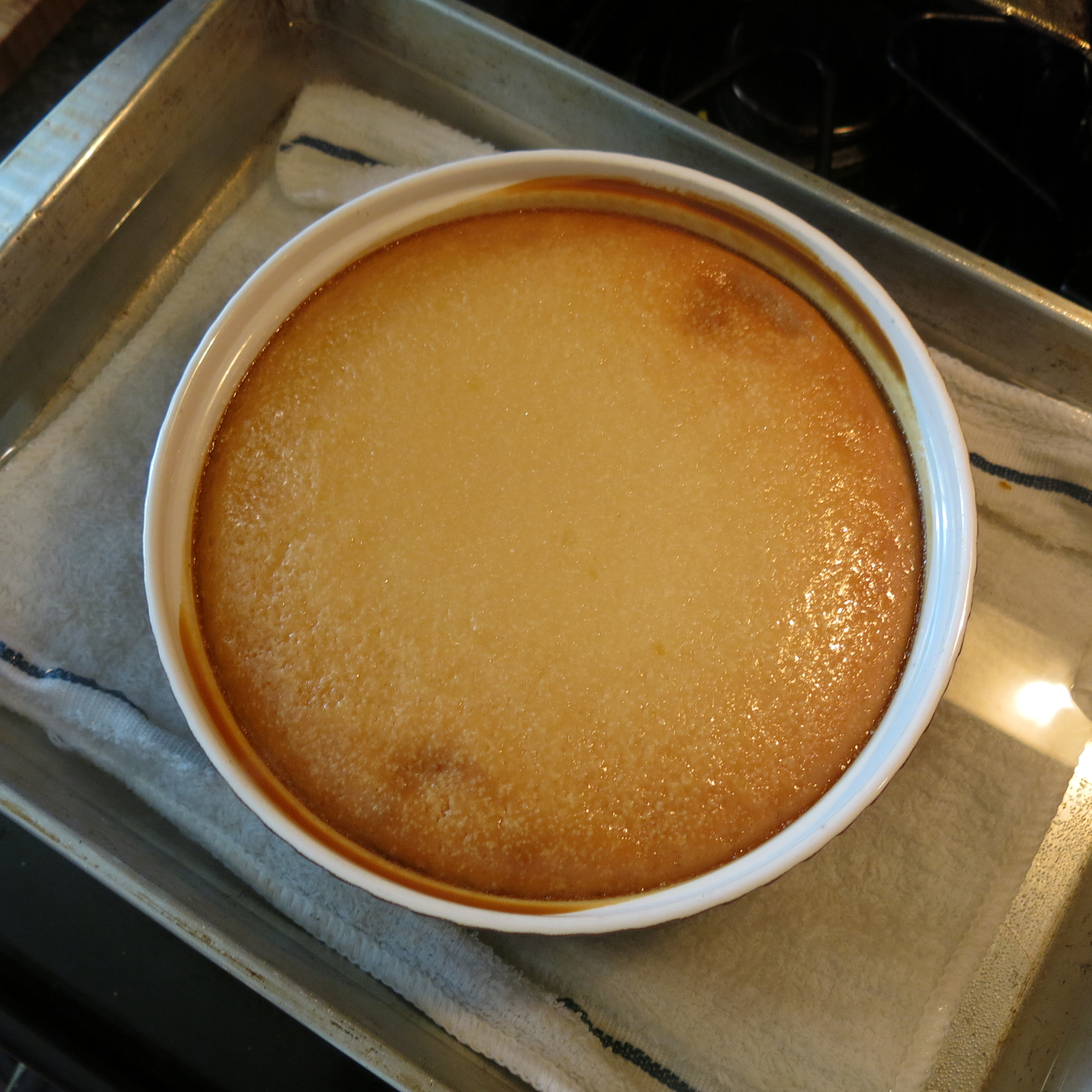 To bake a flan properly you need to make a bain Marie, or hot water bath. You want to protect this food of the Gods from the heat, so you put it in a hot water bath! Makes perfect sense, no? This is a gentler, more compatible heat than the dry heat of an oven and actually does protect the eggs from curdling. If you bake a flan without the benefit of a bain Marie, the consistency becomes grainy and is everything you don’t want a flan to be. Simply use a pan that will allow about an inch all the way around the dish you’re protecting. I use a 9X13-inch aluminum pan. Place a dish towel/cloth on the bottom to protect the flan from the heat, place the flan-filled dish on the cloth and place this combobulation in the oven. Now, carefully pour in enough almost boiling water to come at least 1 inch up the side of the flan dish, but the higher the water, the more protection. Just becareful not to get water in the flan. You can see in the picture that I’ve pulled the oven grate out…sliding it back in can be a bit tricky, but just take it slow.