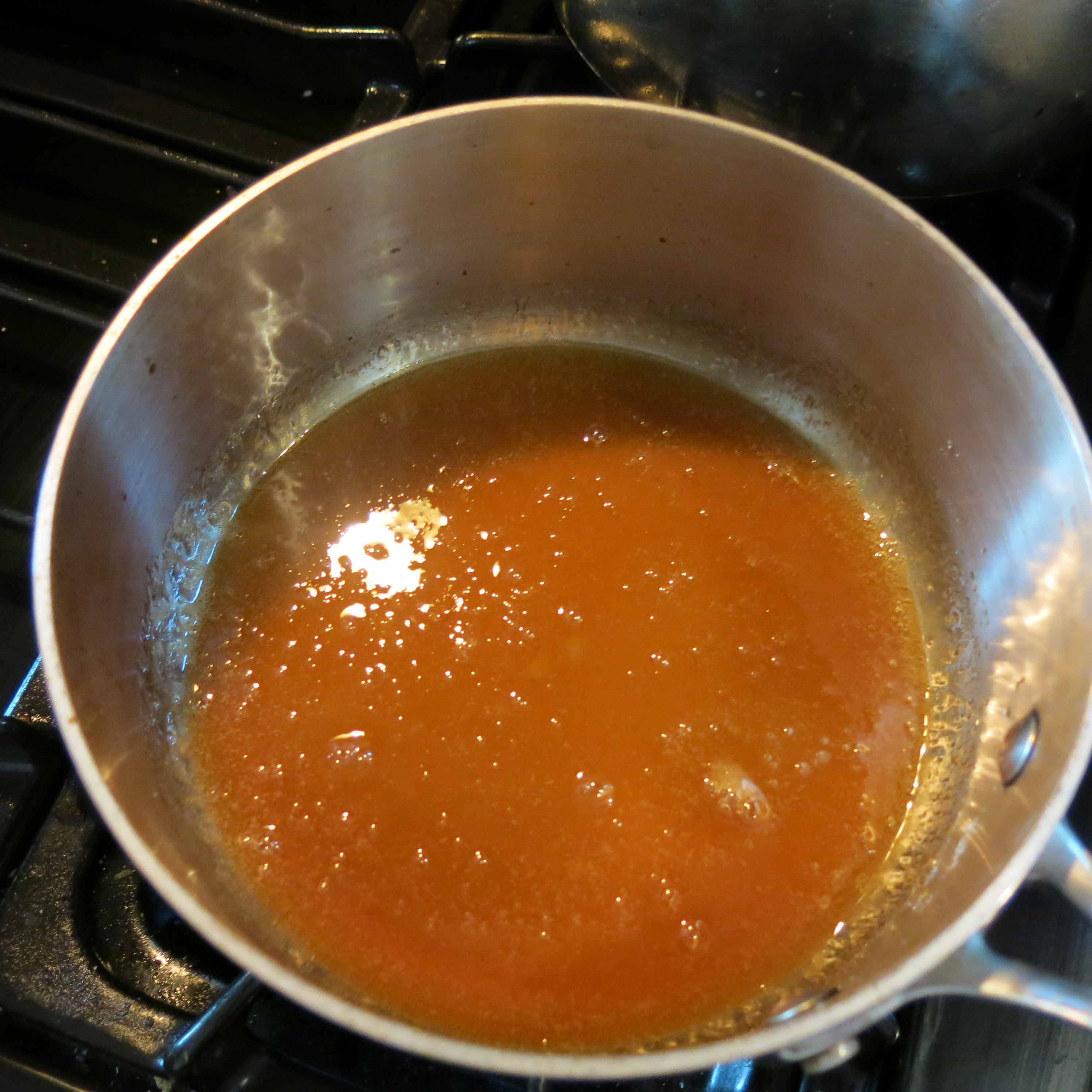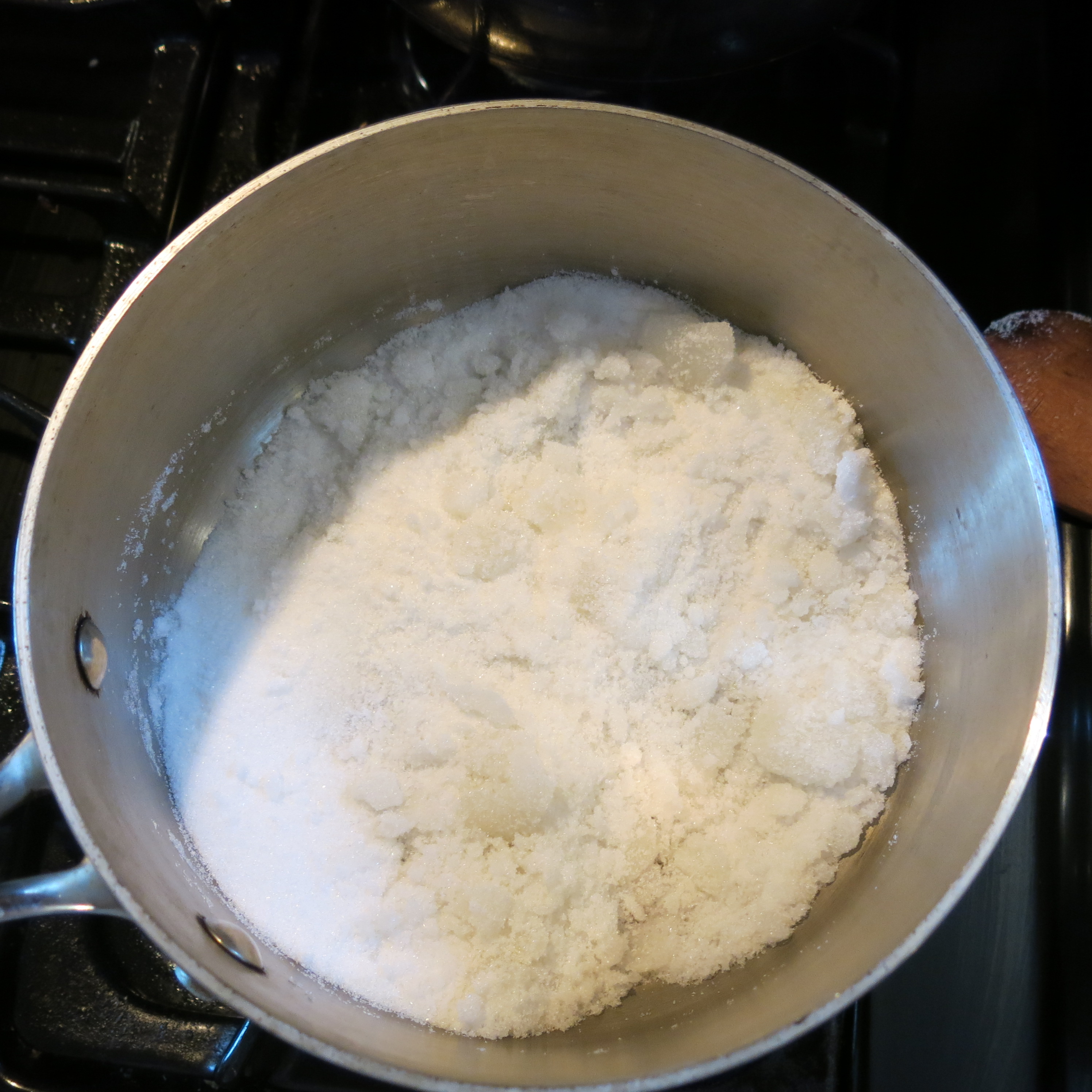 Begin with the sugar. I don’t add water, because you just have to evaporate the water out anyway, so it slows down the process.