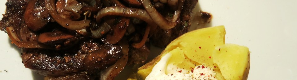 When the onion mixture is done, place the steaks on warm plates, add the baked potato and I’ve added a piece of Italian bread smeared with some Garlic confit. I also drizzled a tablespoon of the oil from the confit over the potato. Serve and enjoy with a nice glass of red wine. Let someone else clear and clean up…after this meal, you deserve it!