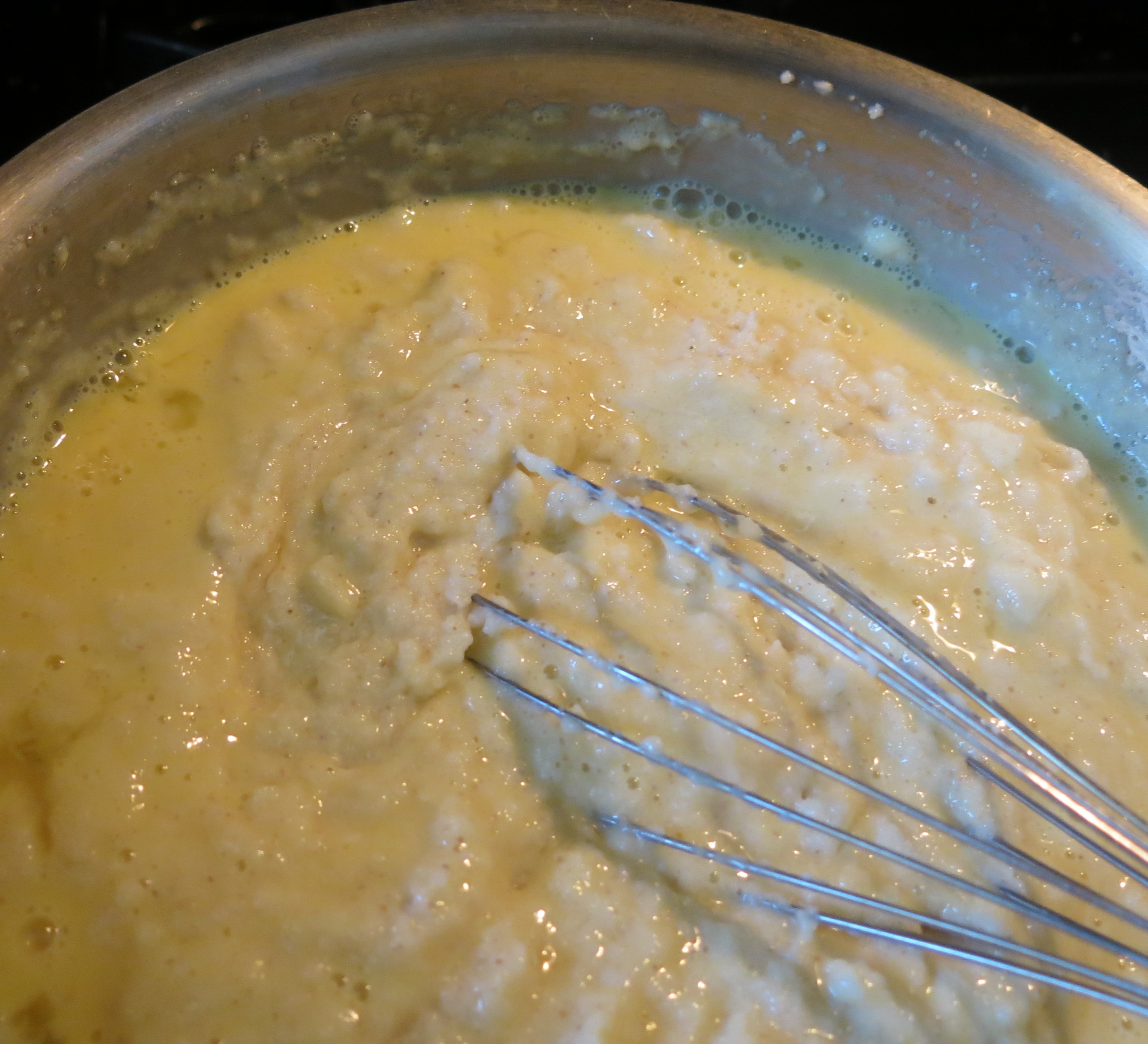 Anyway, add the egg/milk mixture all at once to the hot cereal, whisking like a windmill in a hurricane. When the mixture is almost boiling, (be careful here as this is a very hot mixture and it tends to “plop” if it boils and you don’t want it to plop on your skin or you’ll may get a nasty burn), remove the pan from the heat. You may want to thin the cereal a bit with additional milk, as this is very thick and that’s how we want it to be.