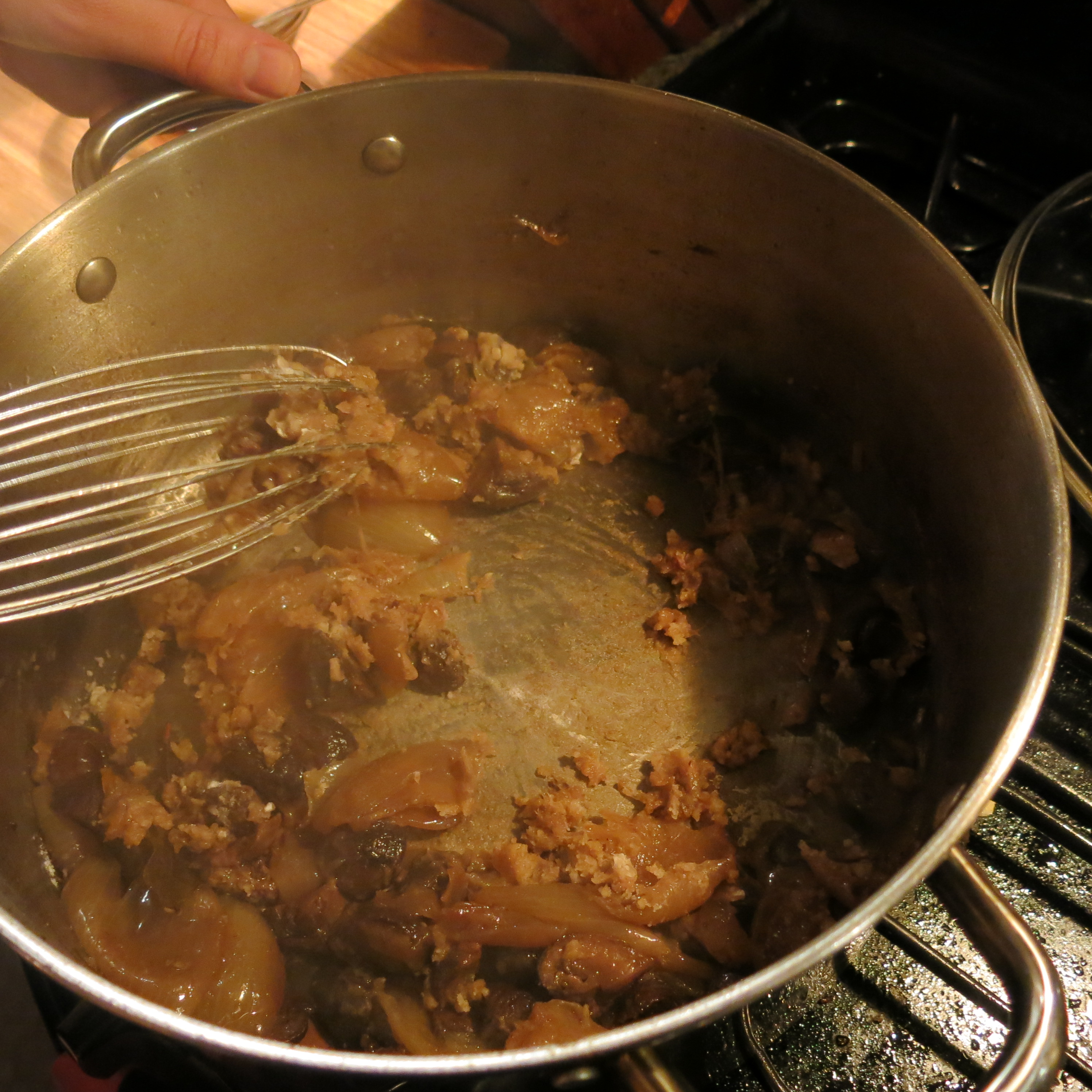 You’re going to make a roux. Return 5-6 tablespoons of fat to the Dutch oven; turn the heat to medium-low. Add the flour to the hot fat and whisk the roux together; this will become paste-like. Continue to cook over medium-low heat for a couple of minutes (this cooks the flour and reduces the raw taste). Now start to SLOWLY add, about 1/2 cup at first, the skimmed drippings back into the mixture, whisking constantly. The mixture will seize a bit, so keep whisking and adding the liquid in 1/2 cup increments until you have loosened the roux up, then add all the liquid. Whisk until smooth. Whisk in 1 tablespoon of ketchup. Taste and correct the seasoning level. You may wish to add the remaining ketchup. Ketchup helps to balance the flavor by adding a bit of sweet and a bit of acid. No one but you will know it’s there. If you want to return the onions and mushrooms to the gravy do so and warm them through.