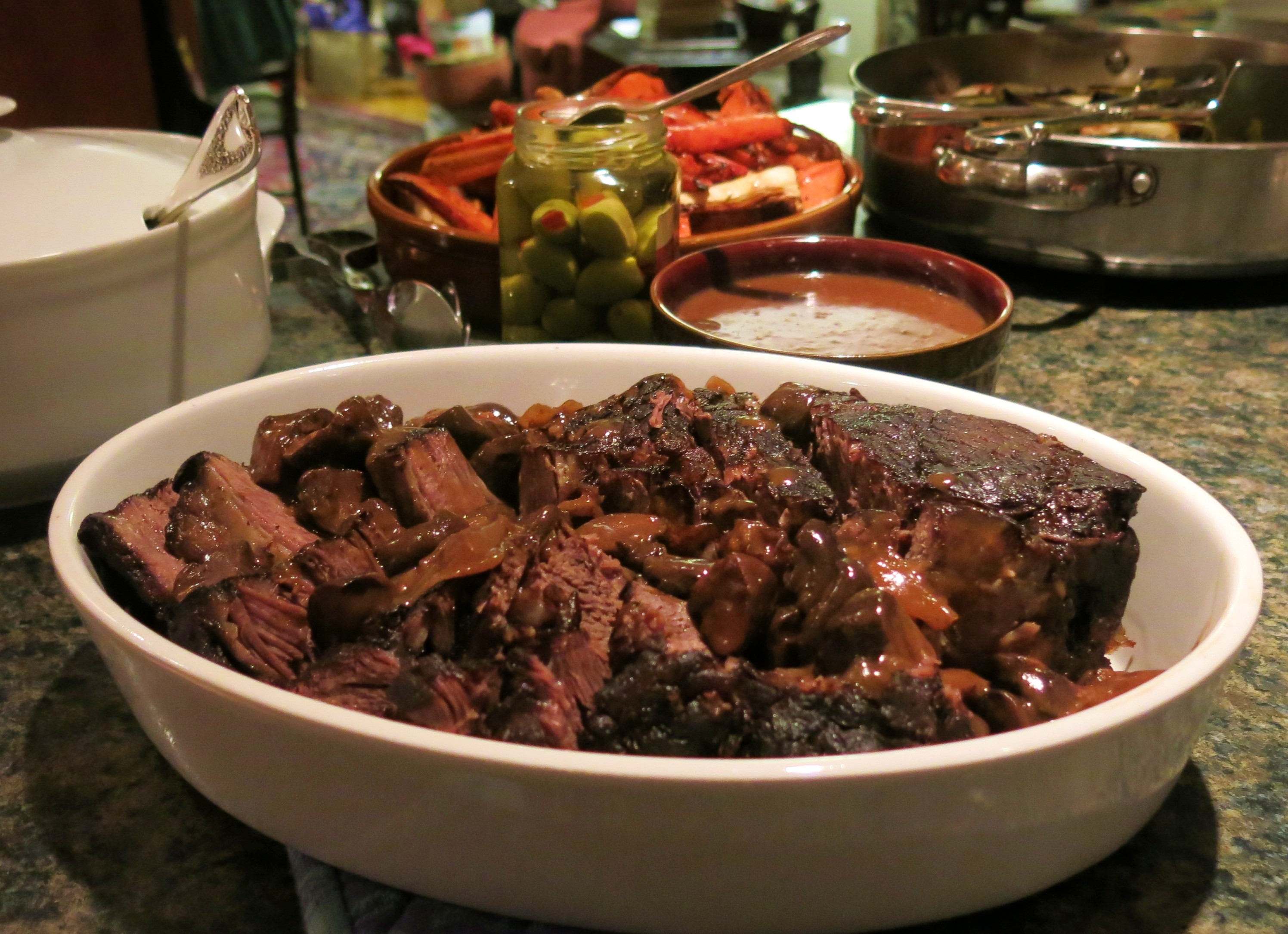 My mother’s pot roasts were legendary, so I learned from the best. We had a wood-burning range in the kitchen and it was perfect for pot roasts. She would sear the meat, then add a small amount of water (we didn’t do wine in those days), cover the Dutch oven tightly and push the pot way to the back of the stove where the fire was low, so the meat cooked slowly, releasing all the flavor it had to give. It would be meltingly tender, with just the right amount of fat running through it. She would toss carrots and onions around the meat and they simmered in the juices until they too, would melt in our mouths. She would skim the fat and make gravy, which too, was legendary. This is, more or less, her recipe for Pot Roast, since she never really used a recipe.