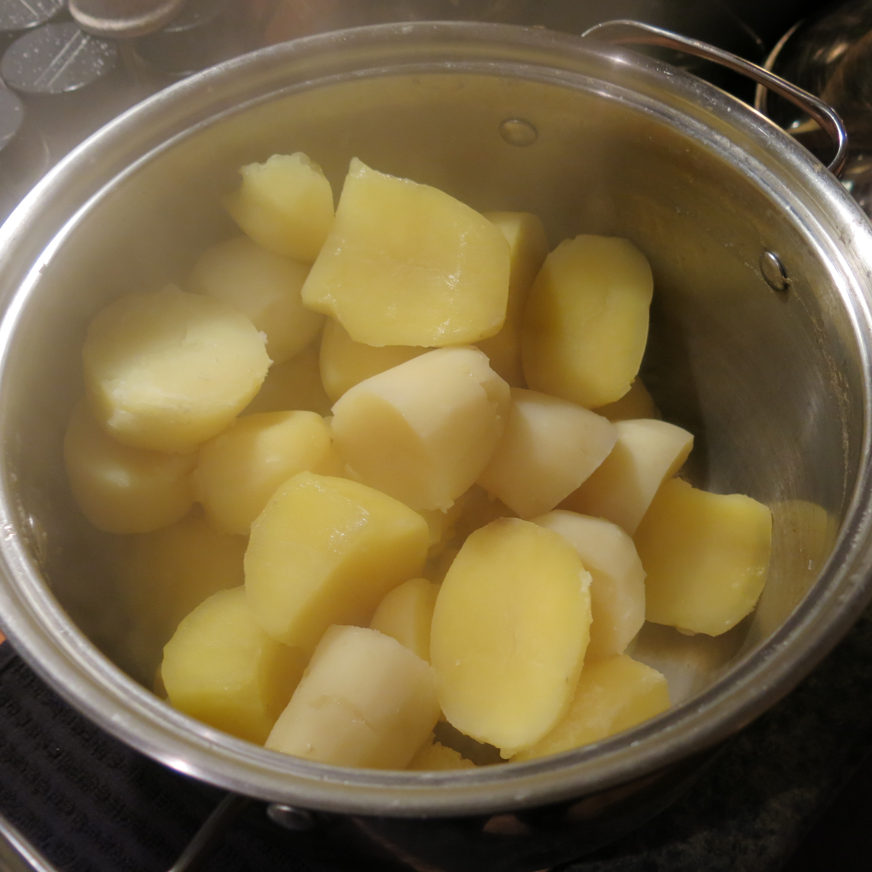 009When the potatoes are tender, remove the pot from the burner, cover and very, very carefully drain, reserving the water; watch the steam, as it can burn you in seconds.  Remember to keep the garlic cloves in with the potatoes.