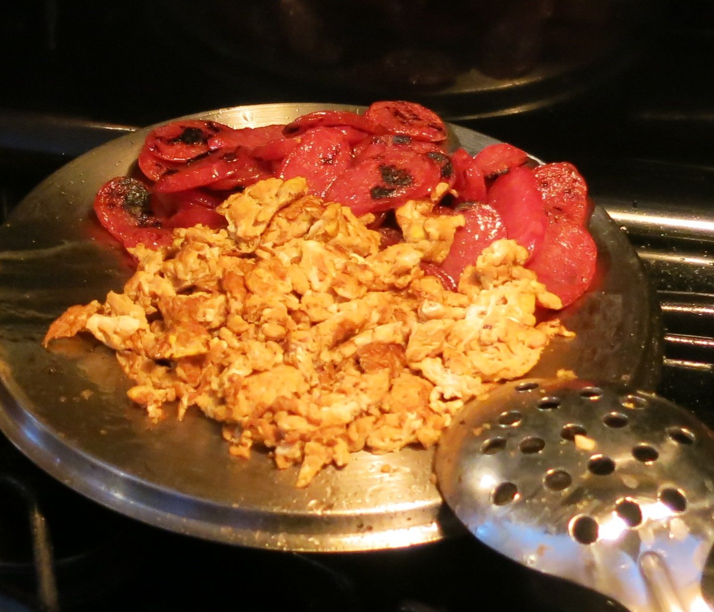 Beat the eggs and soy sauce together. Add to the skillet and scramble the eggs until they are dry; cutting them up as you scramble them. Set aside.