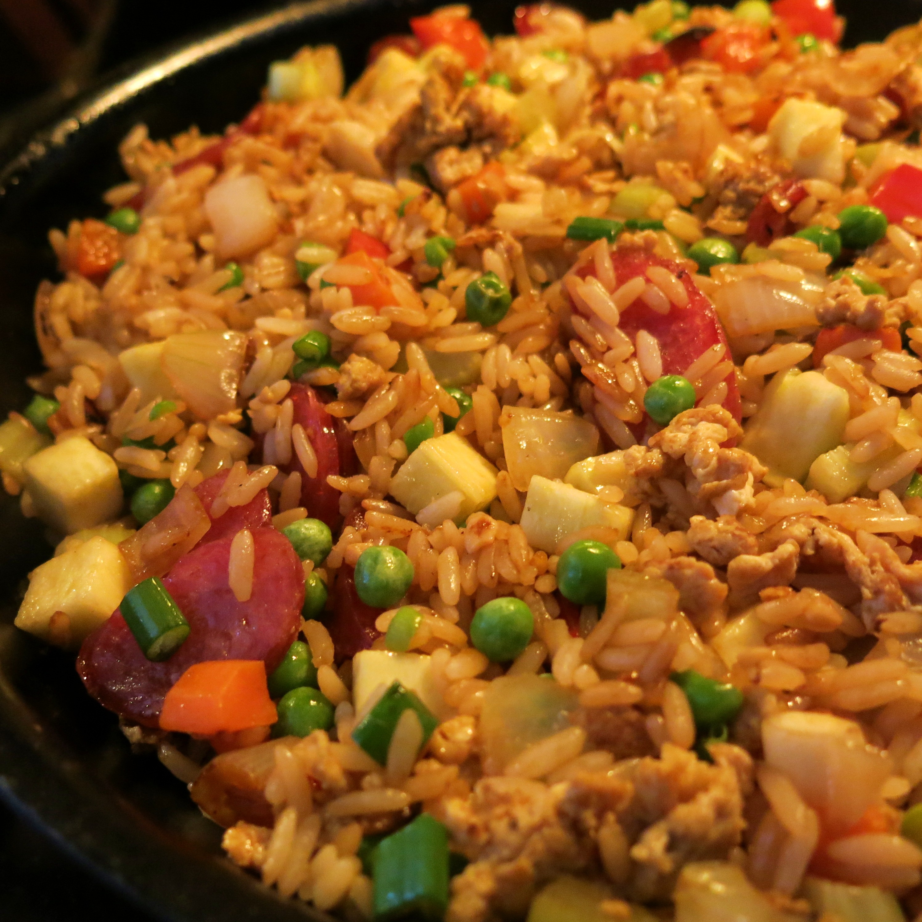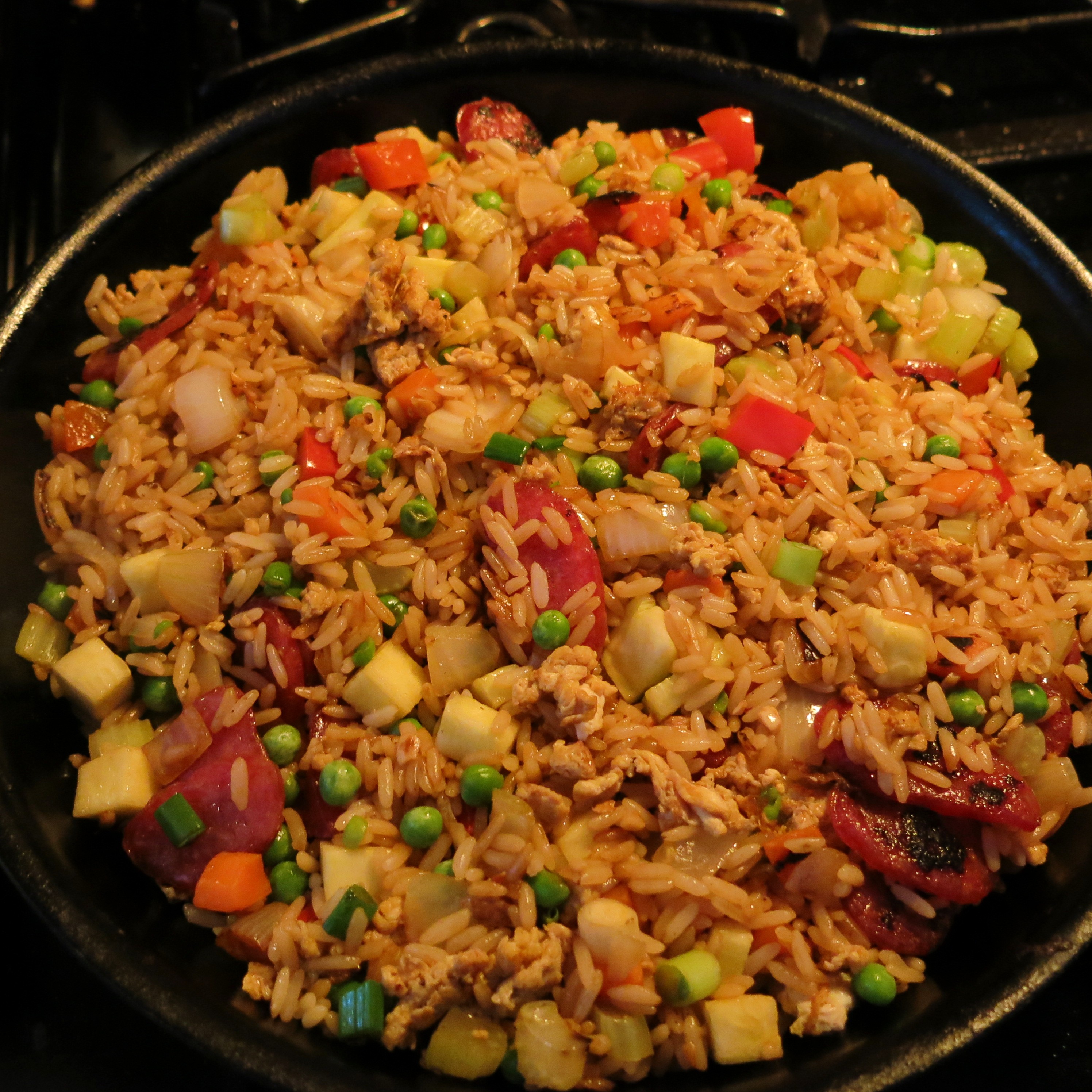 If needed, add oil skillet (or wok). Add the carrots and stir-fry for about 2 minutes. Add the rice, ginger, garlic, onions, bell pepper, celery and zucchini. Let the whole thing stand for at least 30 seconds, then toss the mixture until the rice on the bottom comes to the top. Let stand again, for about 1 minute. Do this several times until the rice is thoroughly hot and picks up a bit of color. At this point, I usually add an additional 1-2 tablespoons of sweet soy sauce (you can use regular soy sauce), sesame oil, chopped scallions and frozen peas, as well as the reserved sausage slices and scrambled eggs. Toss yet again until evenly mixed and the peas have thawed, about 1 minute. Serve immediately.