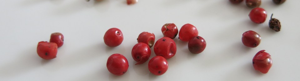 Pink Peppercorns (Schinus terebinthifolius), a.k.a. Brazilian Pepper, Rose Pepper and Christmasberry aren’t true peppercorns. That’s right, they’re all dressed up, pretty as can be in that deep, sexy pink; they look like peppercorns and they have a nice peppery taste, so what’s the deal? Well, they’re imposters, I tell you. Pink peppercorns are grown in the Réunion Islands, for the European market, but for the North American market they are grown in both Brazil, Peru (they are indigenous to Peru) and to a lesser degree, in other tropical and sub-tropical climes, such as Florida (where they are considered a pest). One of the Amazon-based tribes used them in beer making, so they’ve been used for culinary purposes for quite some time. I’ve also read that some Chilean wine producers use them in their wines, but I don’t know if that’s true or not.