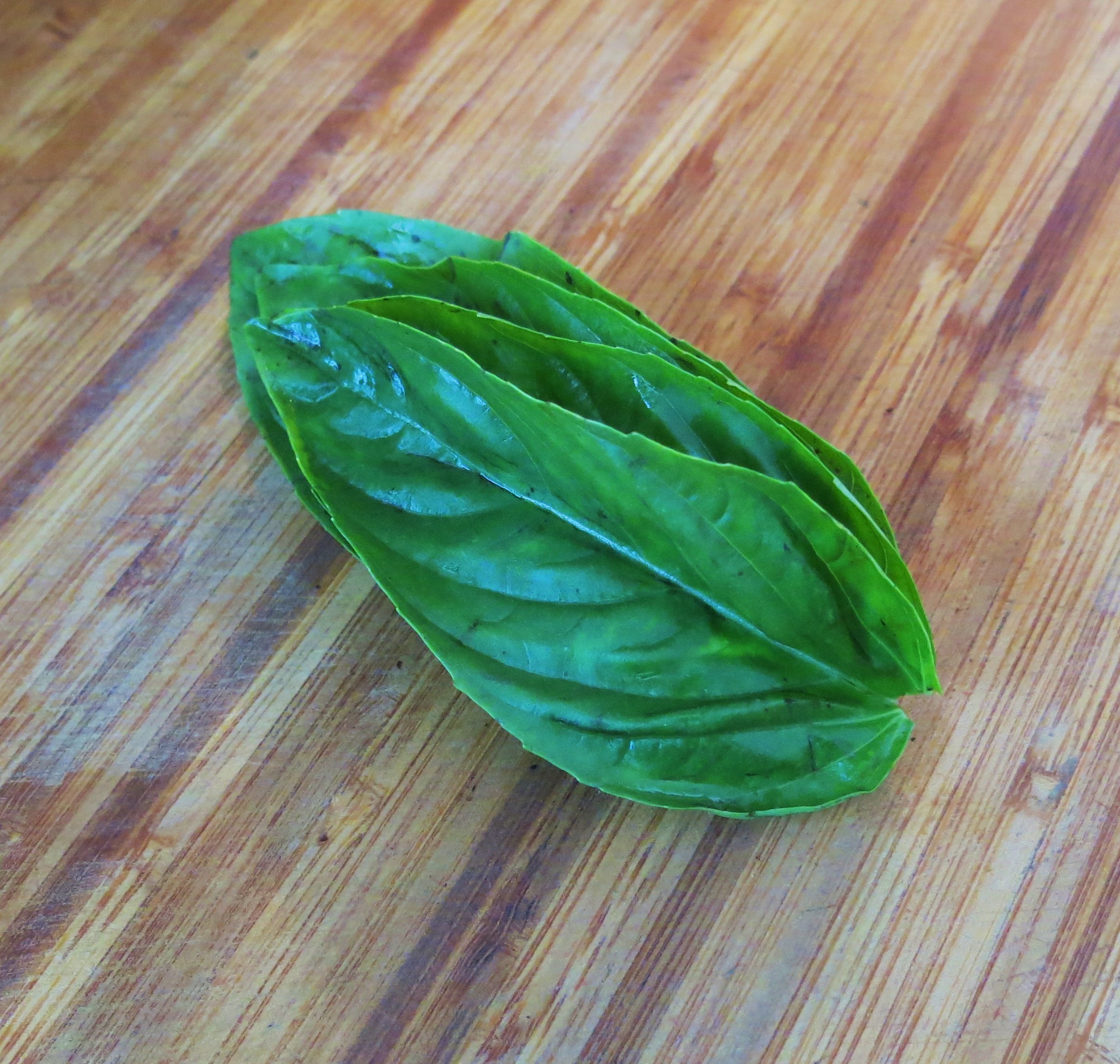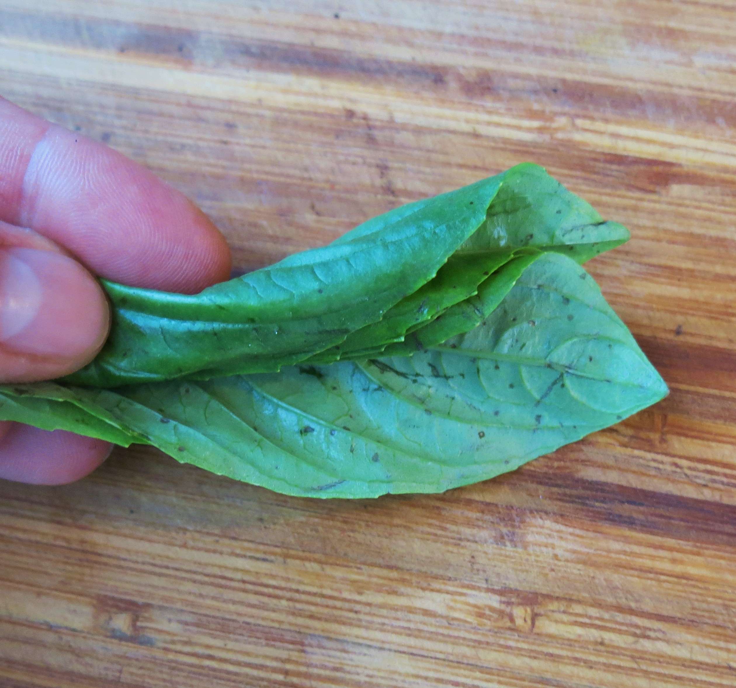 It is accomplished by simply laying several large leaves, in this case, the leaves are fresh basil one-on-top-of-the-other.
