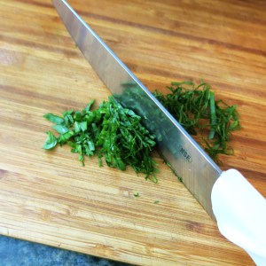 This is a pretty straight-forward recipe. In case you aren’t familiar with the term chiffonade; it is a technique in which herbs or leafy green vegetables are cut into long, thin strips.