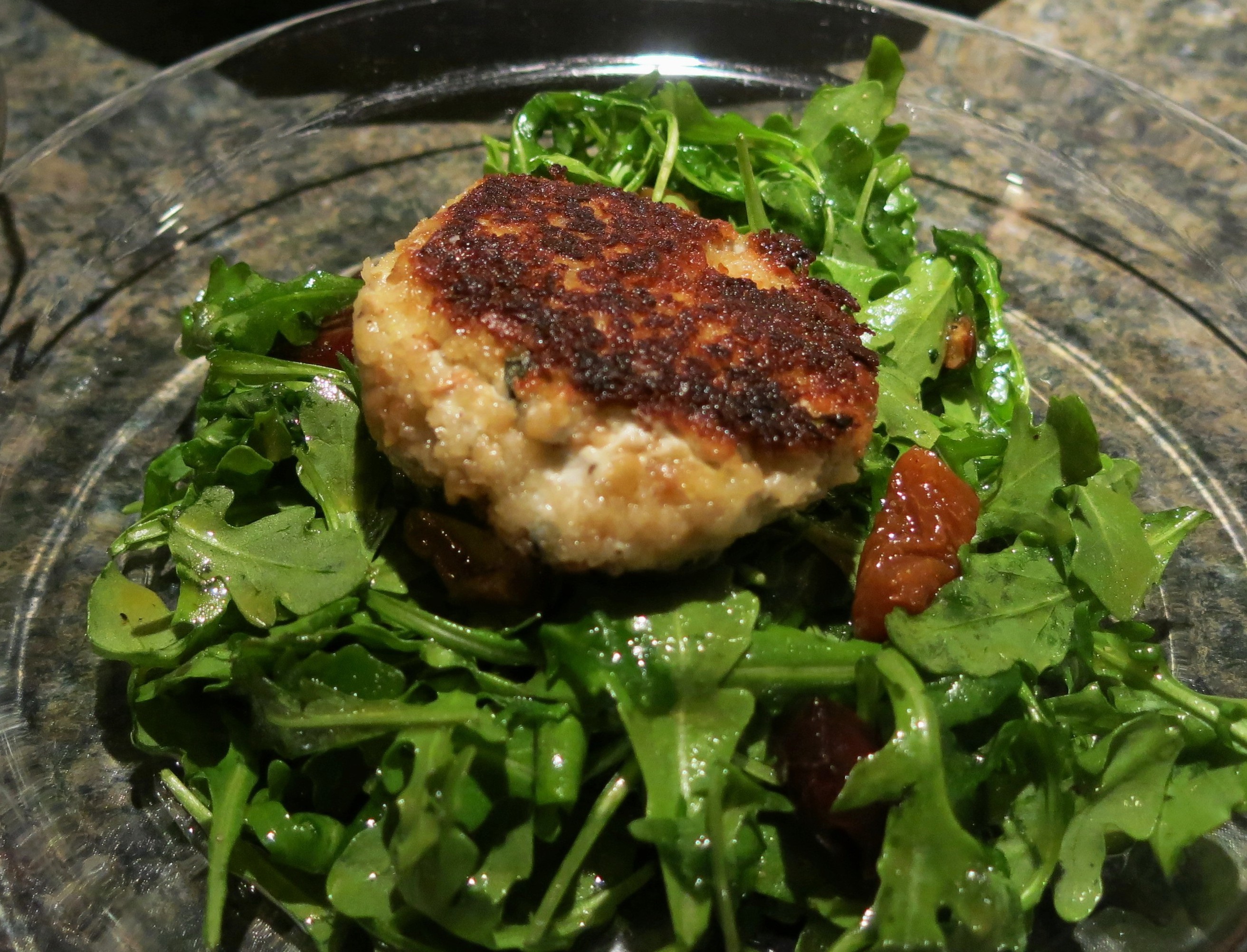 He served these lovelies over baby arugula that had been dressed with a honey vinaigrette. Those flavors play off each other spectacularly well. The Goat Cheese Cakes can be made ahead and then pan-fried at the last moment, just before serving. Dan also mentioned that these can be formed into smaller “patties” and used for hors d’oeuvres or as a first course. I think drizzling them with a maple syrup reduction or a balsamic reduction could be a nice complement of flavors, too. Here’s Dan’s recipe.