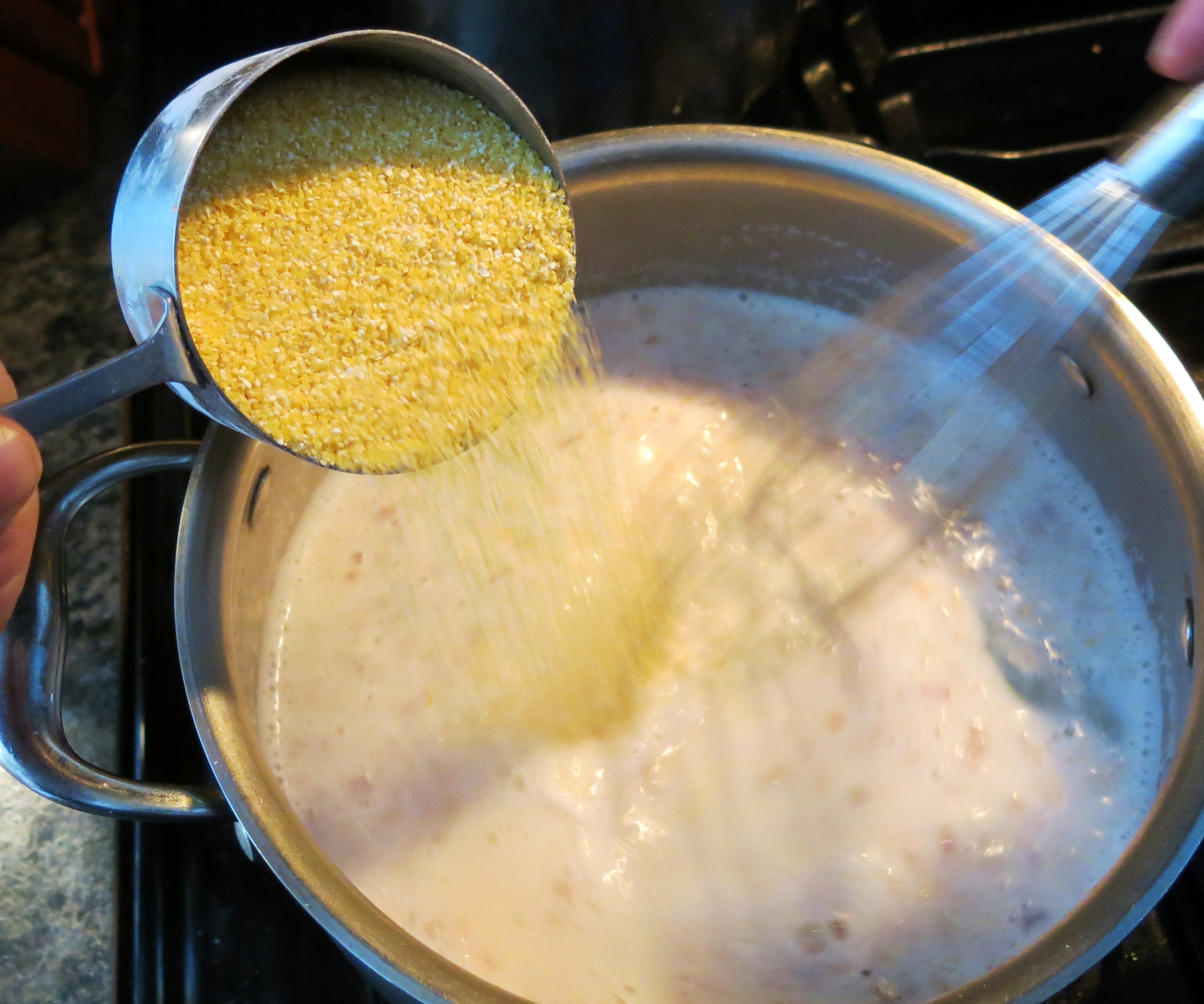 Then you whisk it frequently, keeping the heat pretty low, until it thickens. You can see the cornmeal beginning to thicken up.