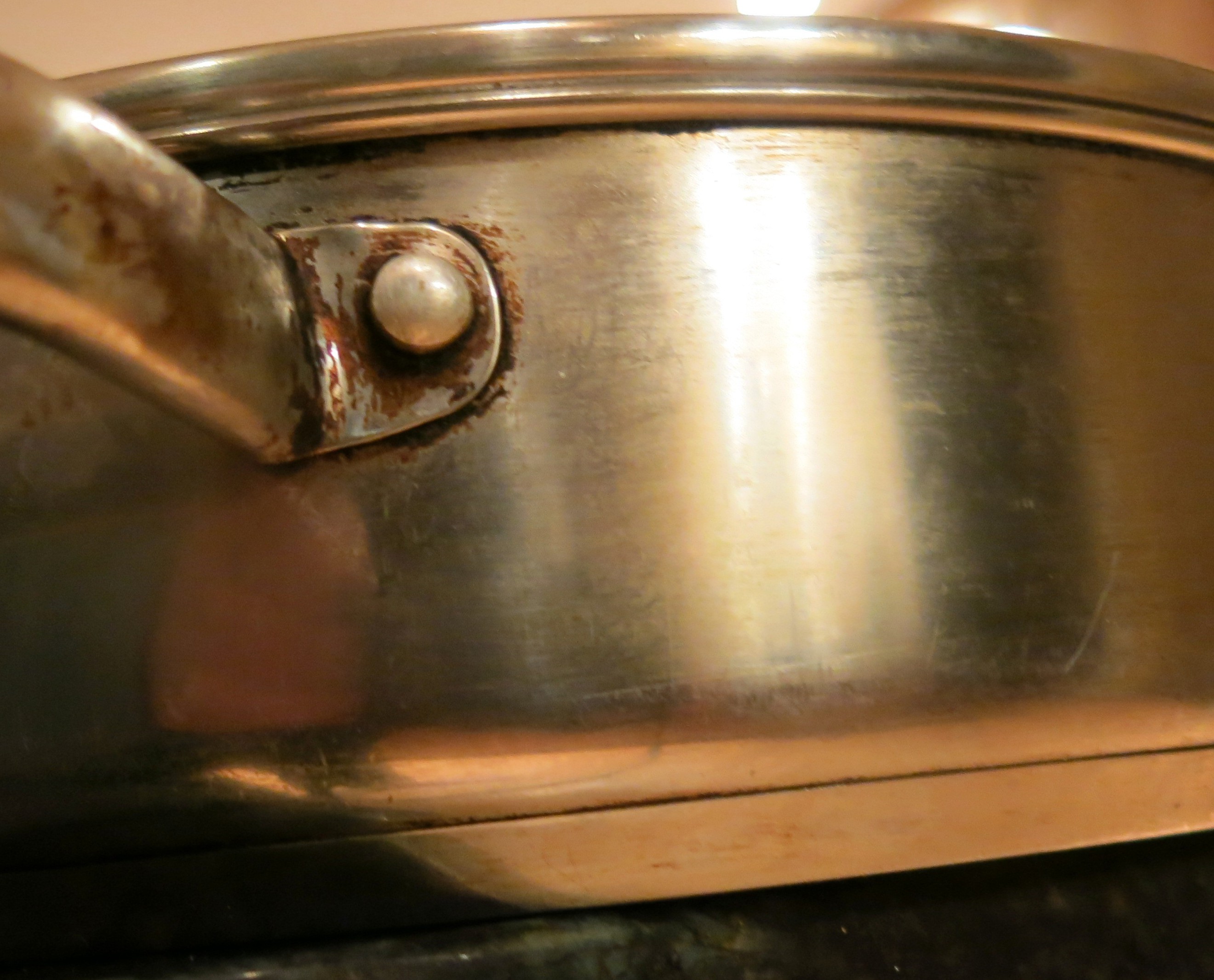 Having said all that, this pan has an encapsulated bottom. It has a triple-layered piece attached to the bottom, not pressed between layers of stainless steel on the bottom and up the sides. It has a tight-fitting glass lid and it’s large, 14 inches across. I love this pan and as you can see, I use this pan a lot.