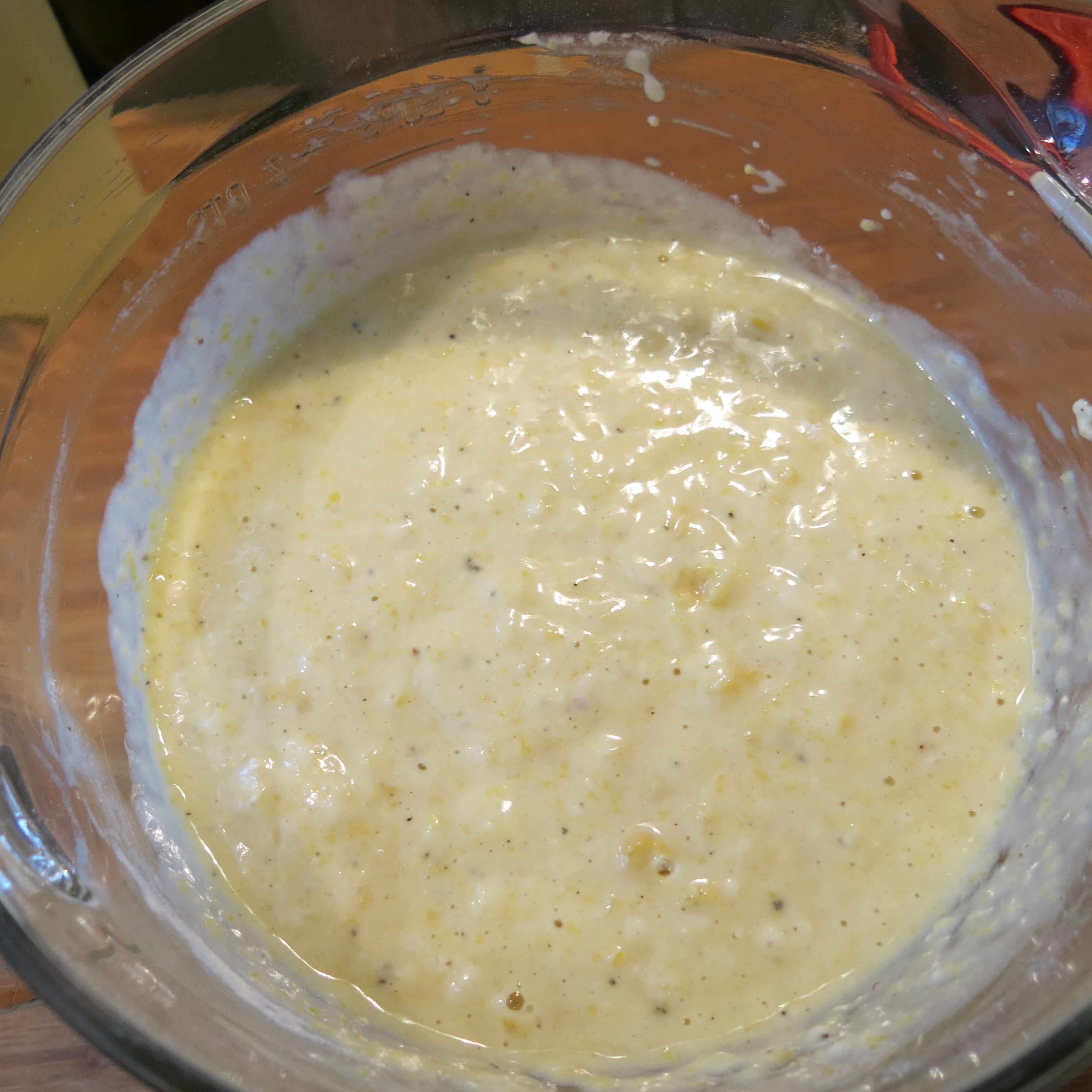 In a mixing bowl whisk to combine the corn, eggs, oil, sugar, buttermilk, vinegar and cornmeal. Set aside for 15-20 minutes to let the cornmeal soften just a tad.