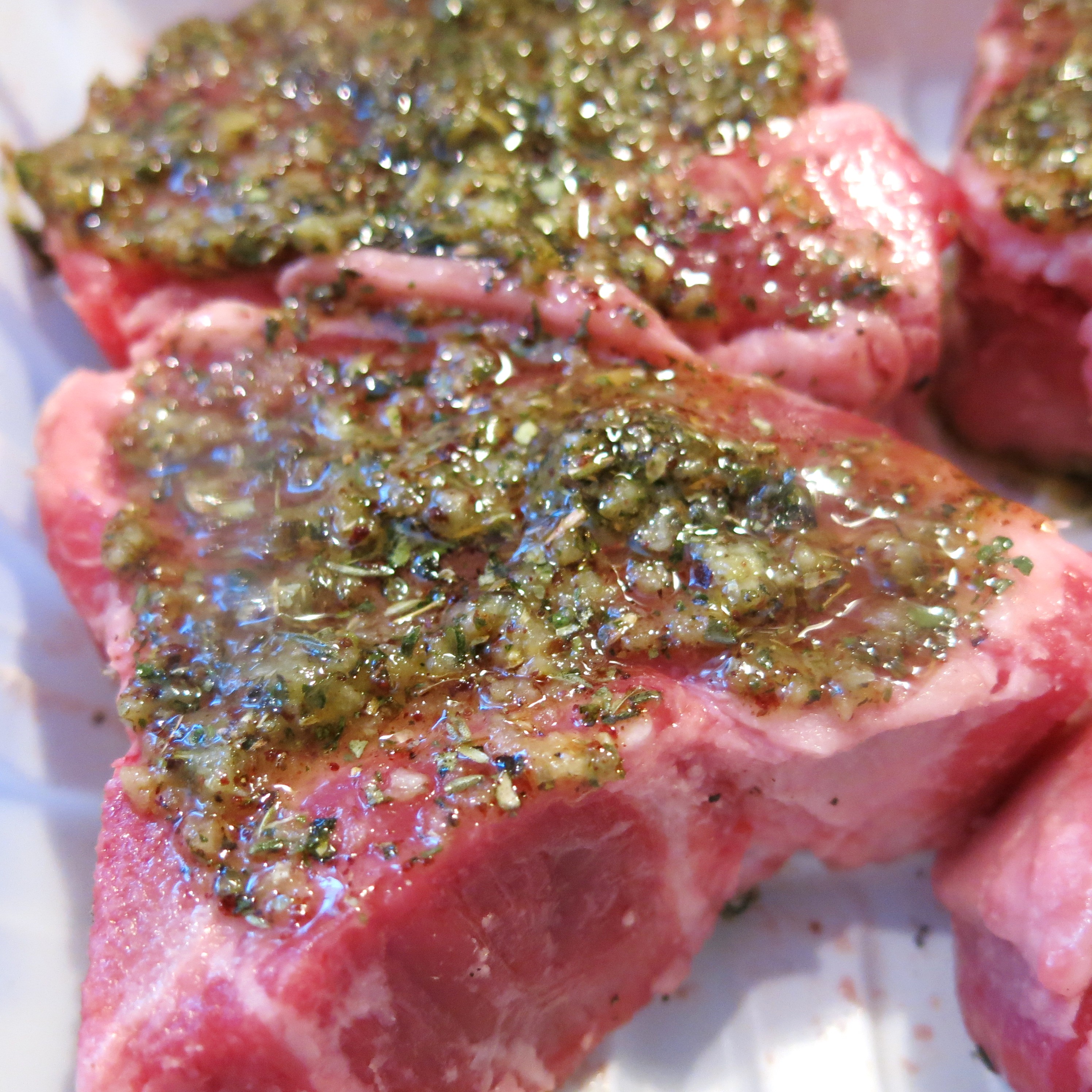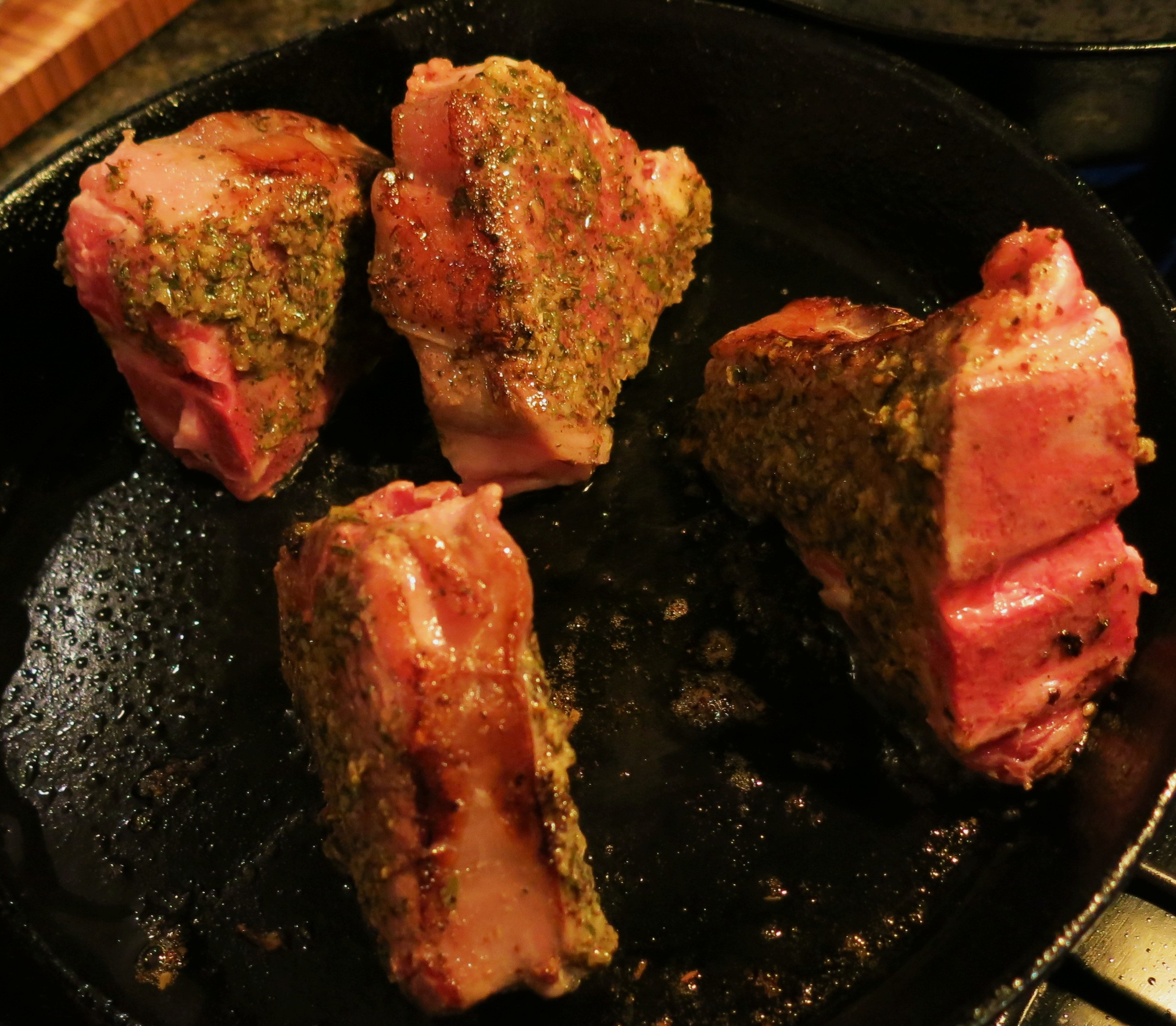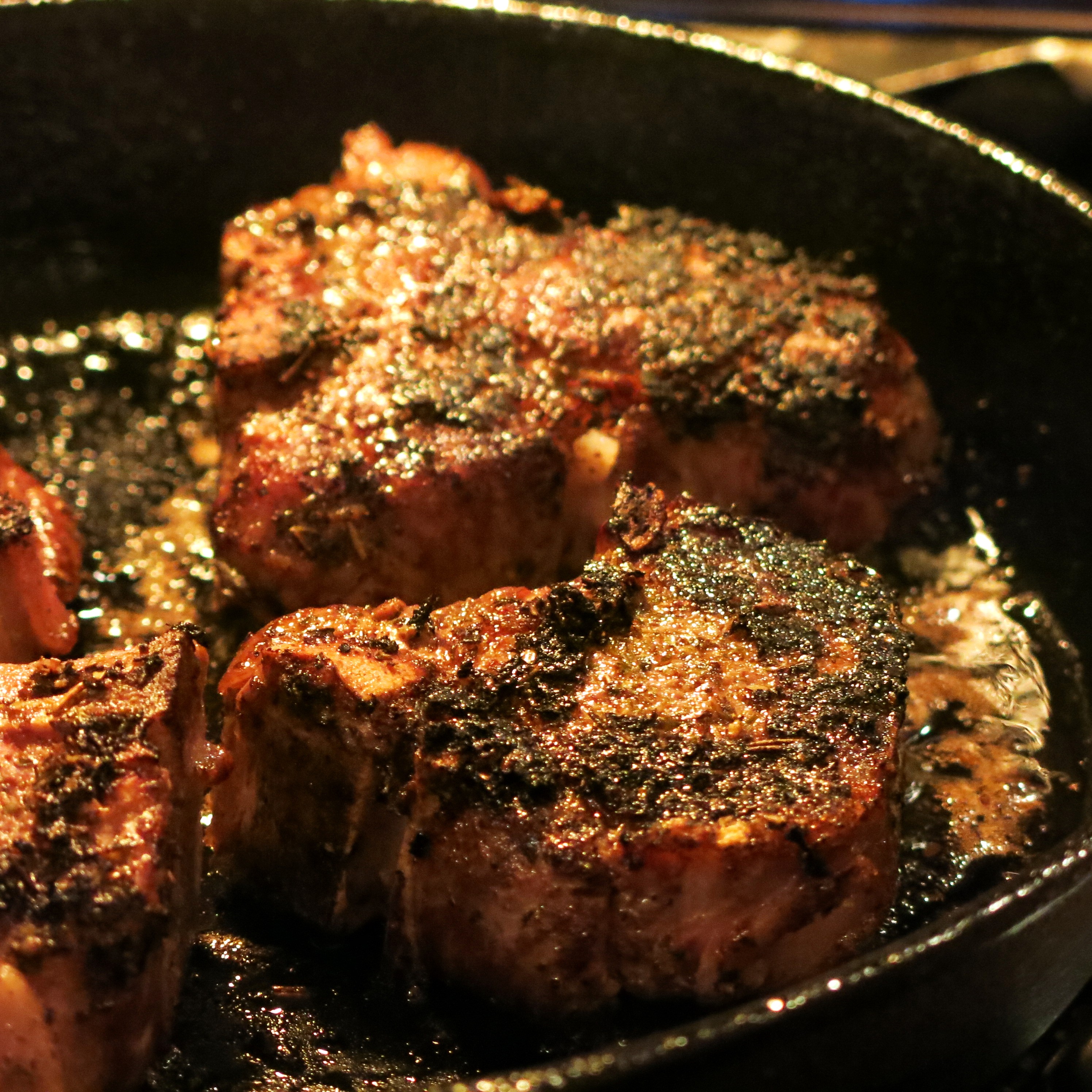 turn (I use a spatula for this, to help keep the herbs on the meat.) and sear 2 minutes on the second side. If they are thicker chops, I add about 30-45 seconds per half-inch. You can always cook them a bit more, but once they are over-cooked….