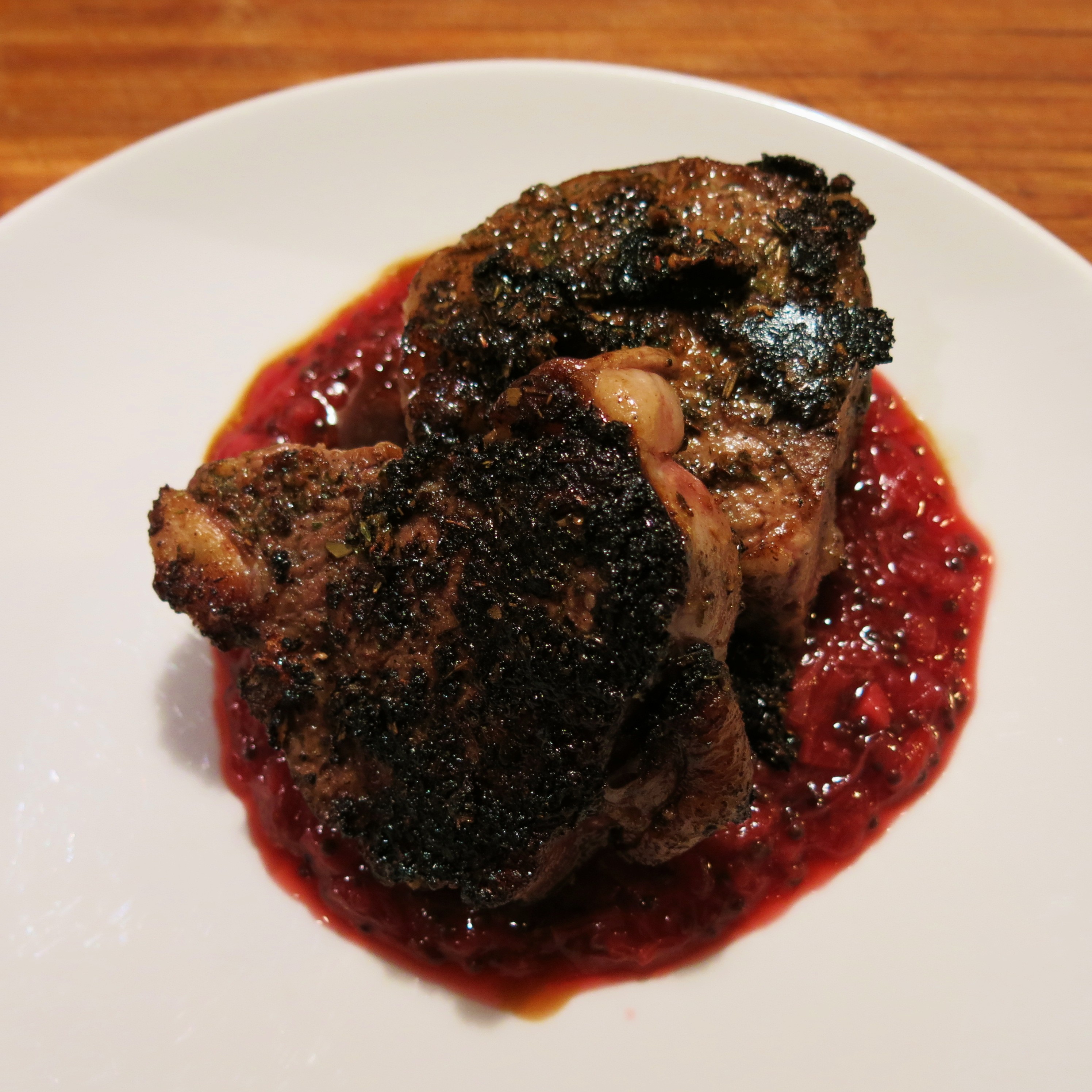 Heat a bit of olive oil in a cast iron (or other extremely heavy skillet). You will want it hot! Turn on the exhaust fan over your stove, and when the oil begins to smoke, drop the chops in, cut sides (the sides with the rub on) perpendicular to the pan. You are going to sear the edges first, about 1 minute total. Now turn the chops cut-side down. Cook for about 3 minutes, turn and repeat, but only cook for 2 minutes on the second side. This whole process will take about 5-6 minutes. The chops will be rare. Remove them from the pan and transfer to a platter; cover loosely with foil and let rest for 5-10 minutes. Do NOT skip the resting period. Serve immediately with Rhubarb-Hibiscus Bourbon Sauce.