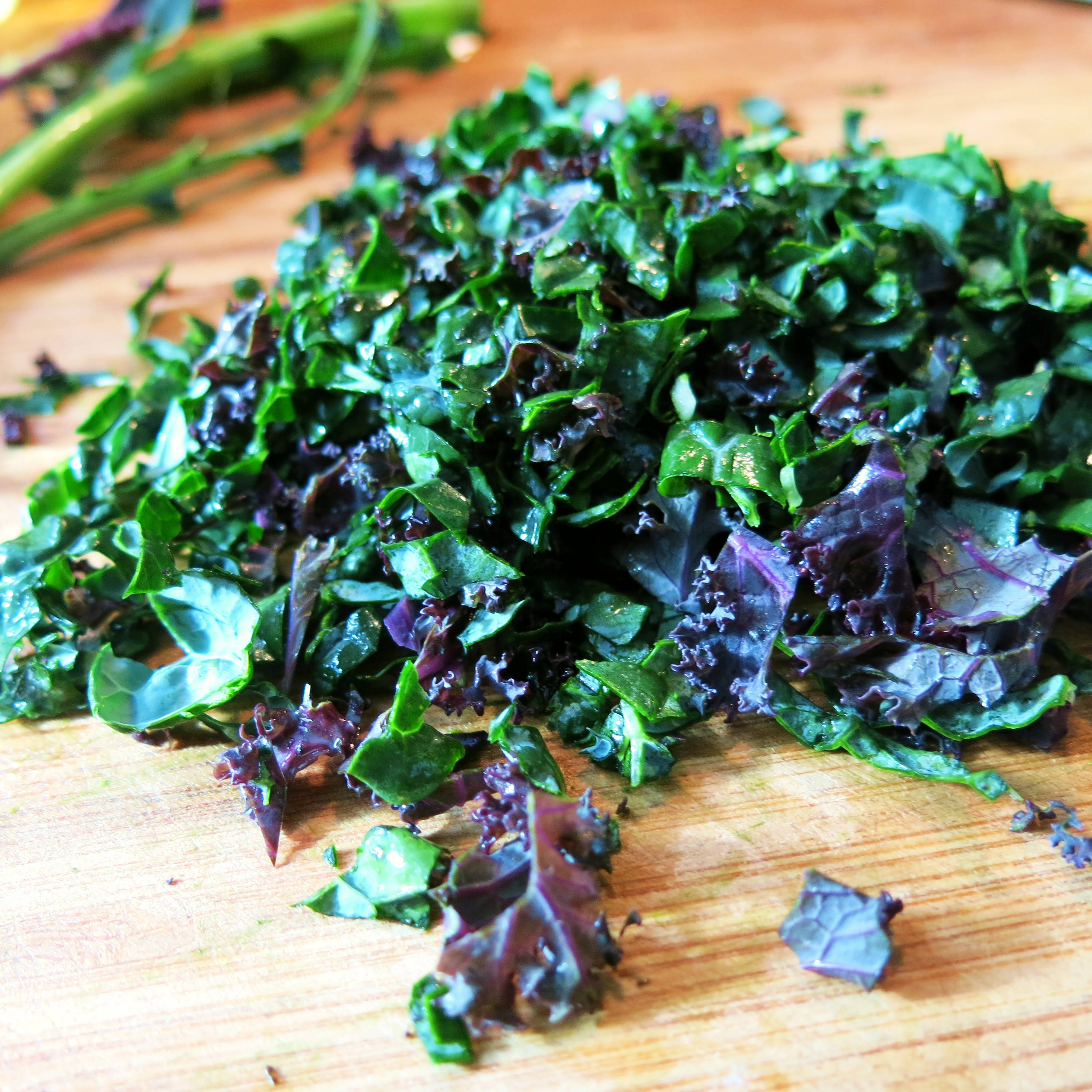 The next day, I added some chopped lacinato and red leaf kale, a good handful. I removed the ribs and just used the leaves.