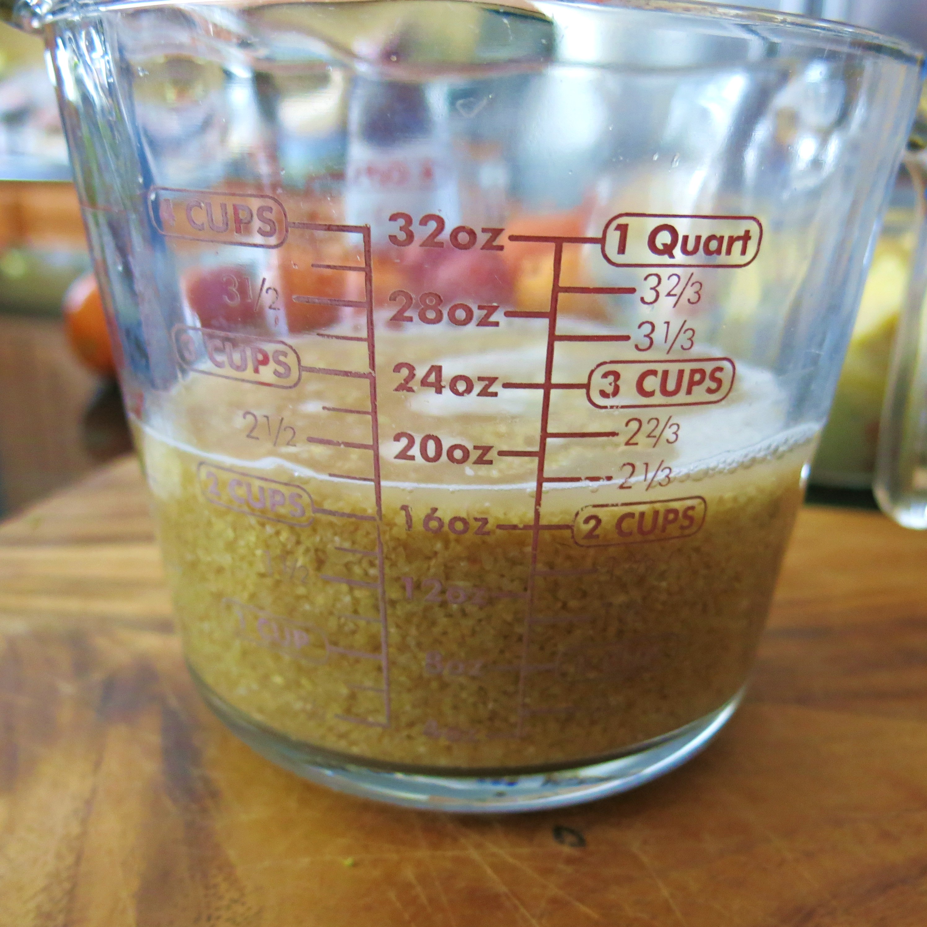 This will totally absorb the water and be rather “fluffy”, not at all water-logged. It’s still dry enough so it will absorb some of the dressing and the liquid given off by the vegetables.