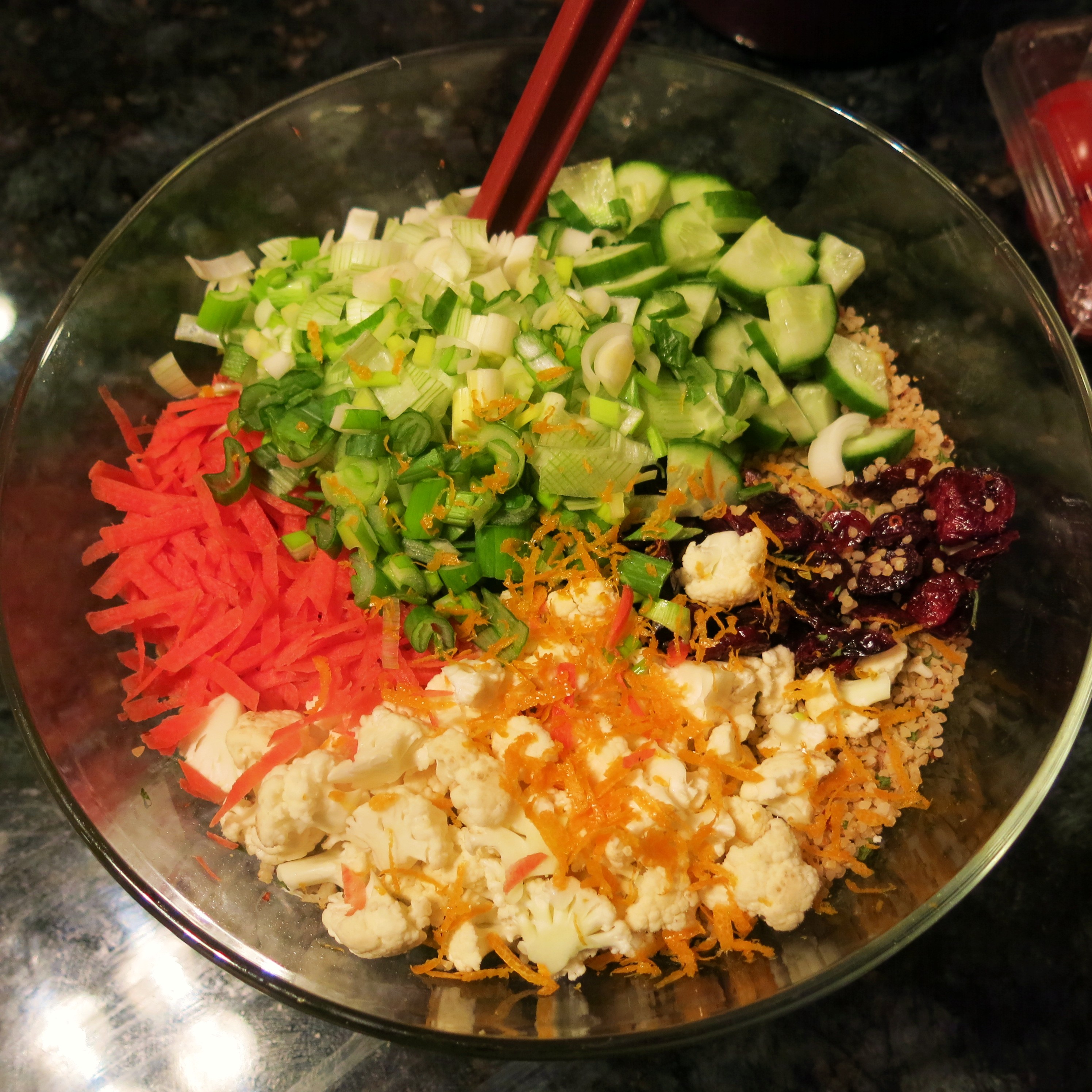 then the chunky stuff of choice. In this case I used a shredded carrot, cauliflower, Persian cucumber, scallions, Clementine zest and sections, dried cranberries and cherries, pistachio kernels and cherry tomatoes (chopped).