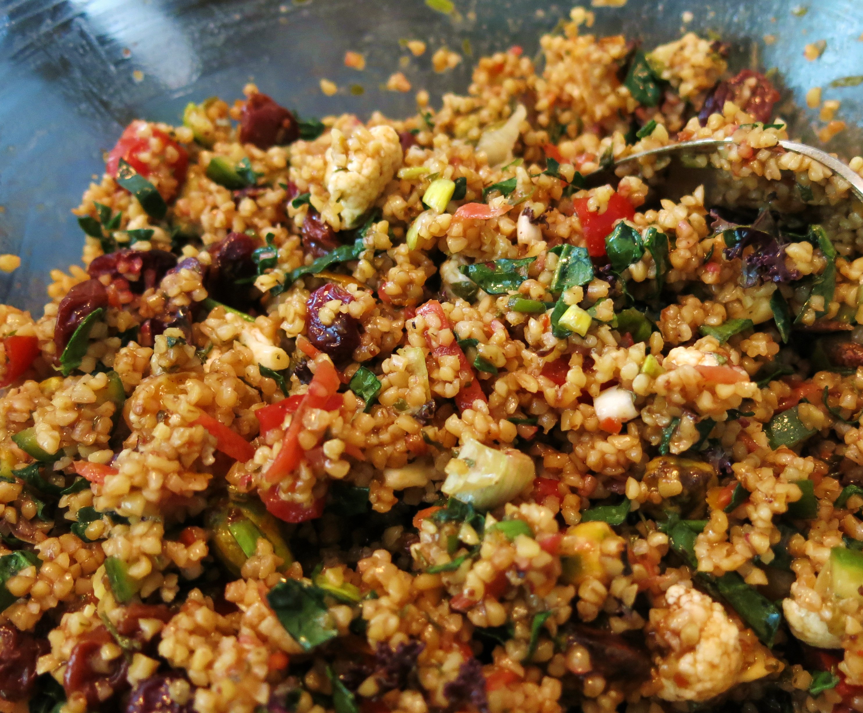NOTE: When freshly made, the salad should taste a bit sharp. The vegetables will “weep” moisture into the bulgur and this will dilute the dressing a bit; you might even need to add more dressing.