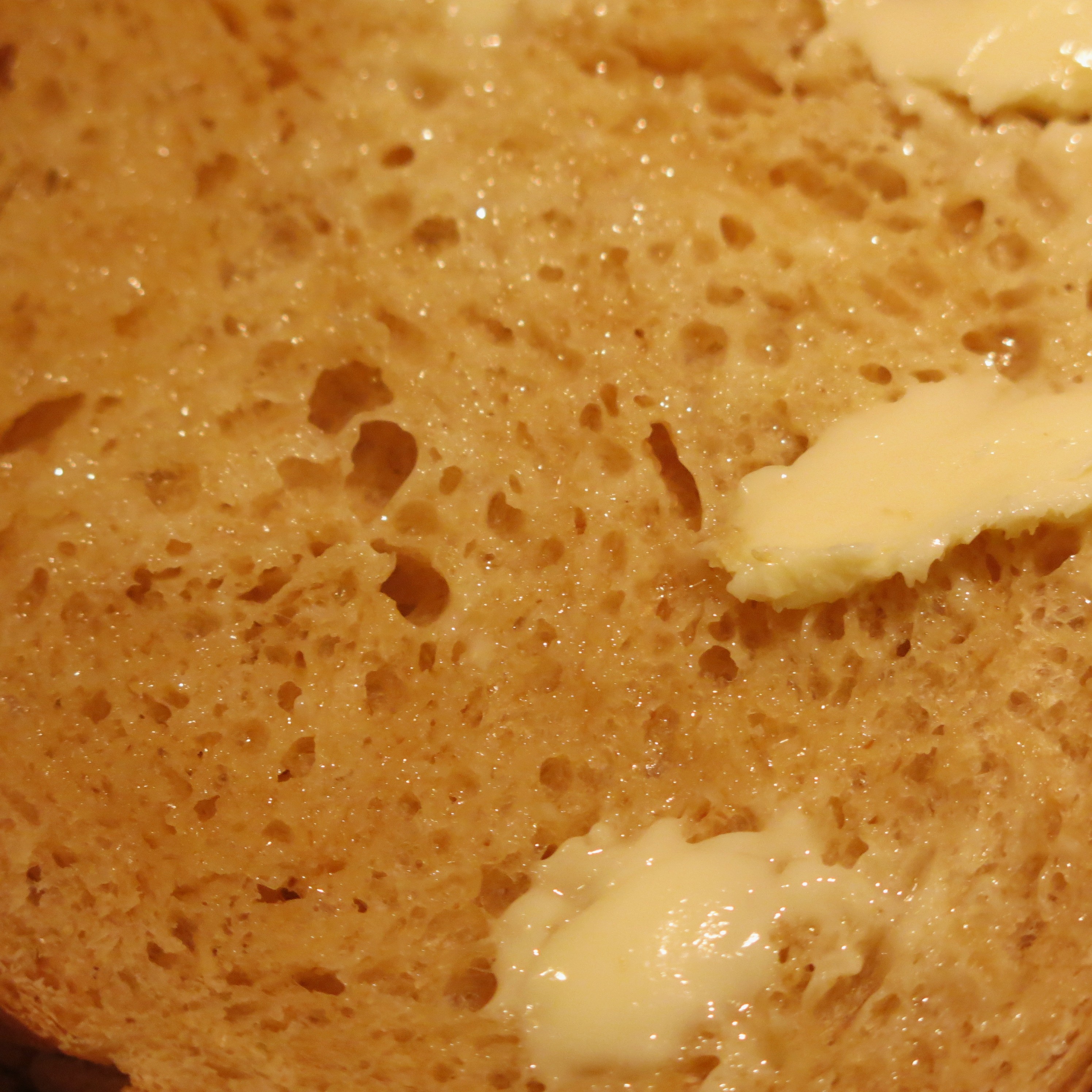 So, gluten, yeast and sugars acting in unison, give bread that lovely elastic quality that is the mark of a good “crumb”. “Crumb” is the overall texture of the bread. There should be tiny pockets, evenly distributed throughout the loaf, which work exceptionally well to soak up butter and jam!