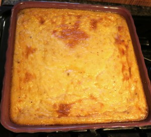 Feel free to add finely minced onion, scallions, or chives. Change the cheese to Swiss or Fontina. Add red pepper flakes or guajillo chile powder and bacon bits. My father loves this with oysters added and part of the milk replaced with and equal amount of oyster liquor (that’s the liquid that the fresh oyster “floats” in). And that’s all there is to it! Cut into squares or spoon it out and thanks for letting me make a memory once again.