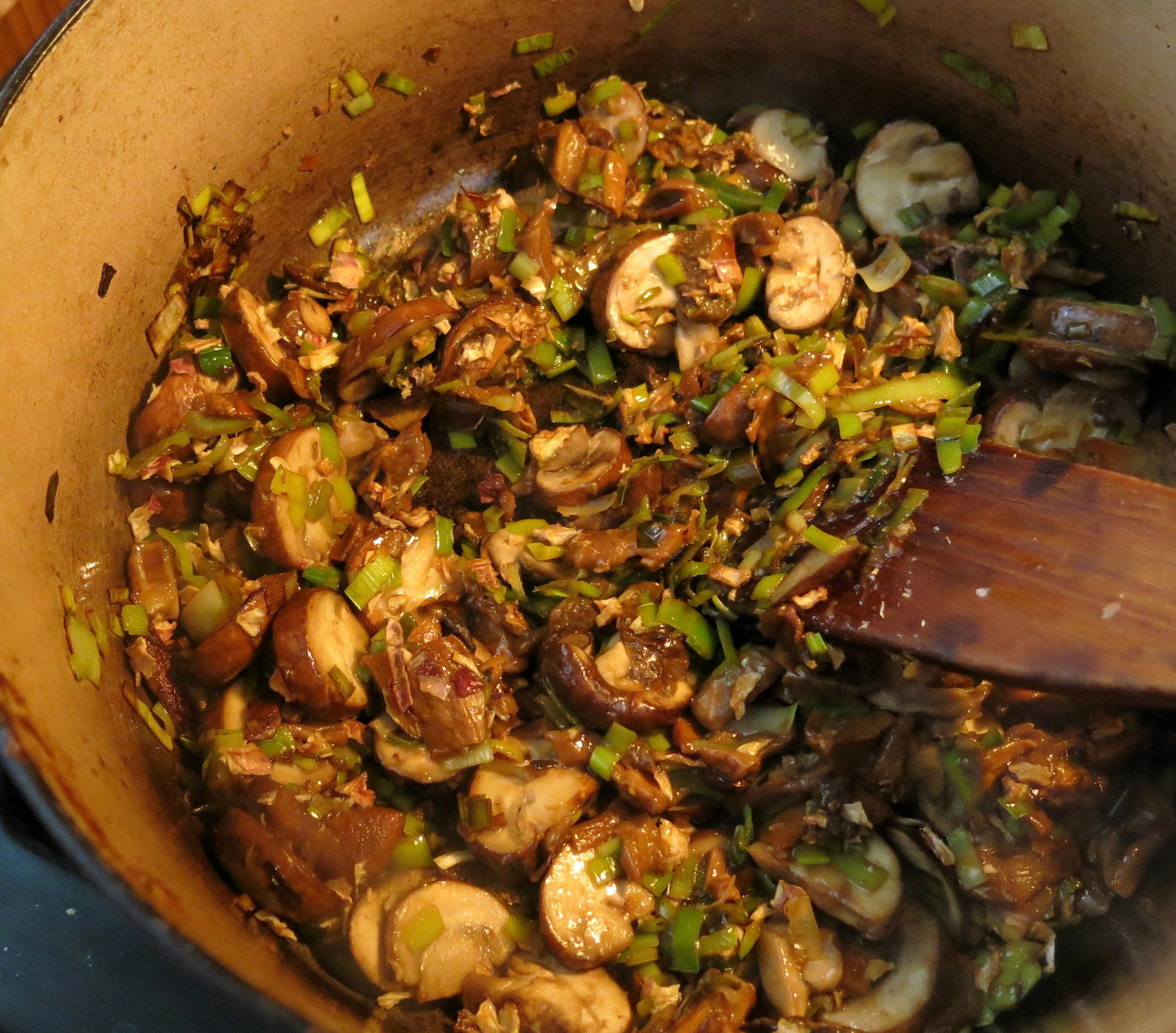 Place the rinsed, dried mushrooms in a bowl; cover with almost-hot water. Stir them a couple of times, pushing the mushrooms down into the water. The water will become beef broth-like in color. They will need at least 30 minutes to rehydrate, but the mushrooms aren’t flexible regarding soaking time. When rehydrated, squeeze out the soaking liquid (I use my very clean hands for this). Strain and reserve the liquid. Coarsely chop the mushrooms; set aside.
