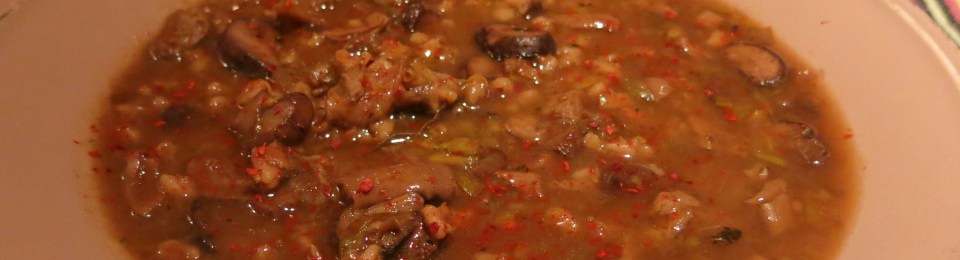 The winter is almost behind us and along with it, the soup pot on the back burner will disappear in favor of quicker, greener and cooler soups. Before we retire the soup pot and since there’s still some snow on the ground, I thought we should have one last comforting bowl of the winter elixir, that is soup. I had some dried mushrooms that had fallen to the back of the cupboard. The Goddess gets busy and these things happen…but, they were found and she thought this might be just the thing, seeing how she dropped them into the bread machine…it was a mess and a testament to her deftness! Well, right in front, on the same shelf, was the jar with the barley. I love barley and I don’t think we use it enough. It makes a great pilaf and an interesting (in a good way) risotto.