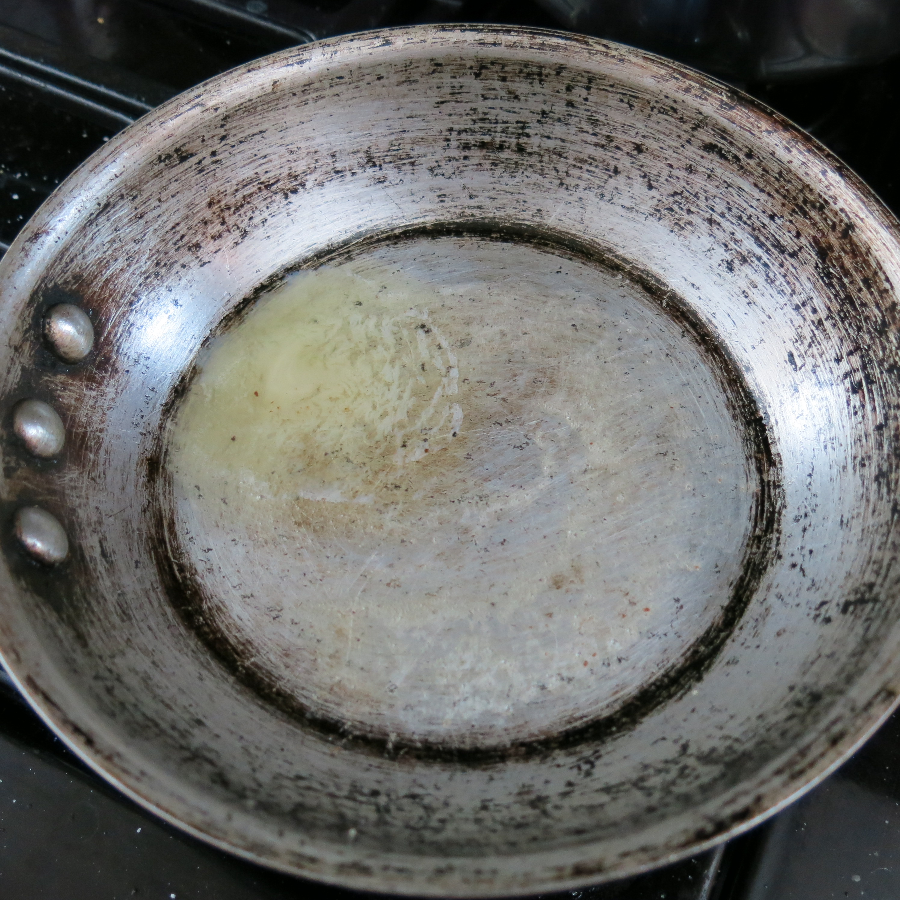 First heat the skillet over medium heat for about 2 minutes. Then add about 1 teaspoon of butter (or oil-olive oil is wonderful for an egg sandwich egg!) and let it melt. It shouldn’t sizzle, or the pan is too hot. If this happens, turn the burner off (or remove the pan from the heating element of an electric stove) and let the pan set for 2-3 minutes. Next, turn the burner down to low. On my gas stove, I’ve found that 2 works perfectly; 1 is a bit too cool.