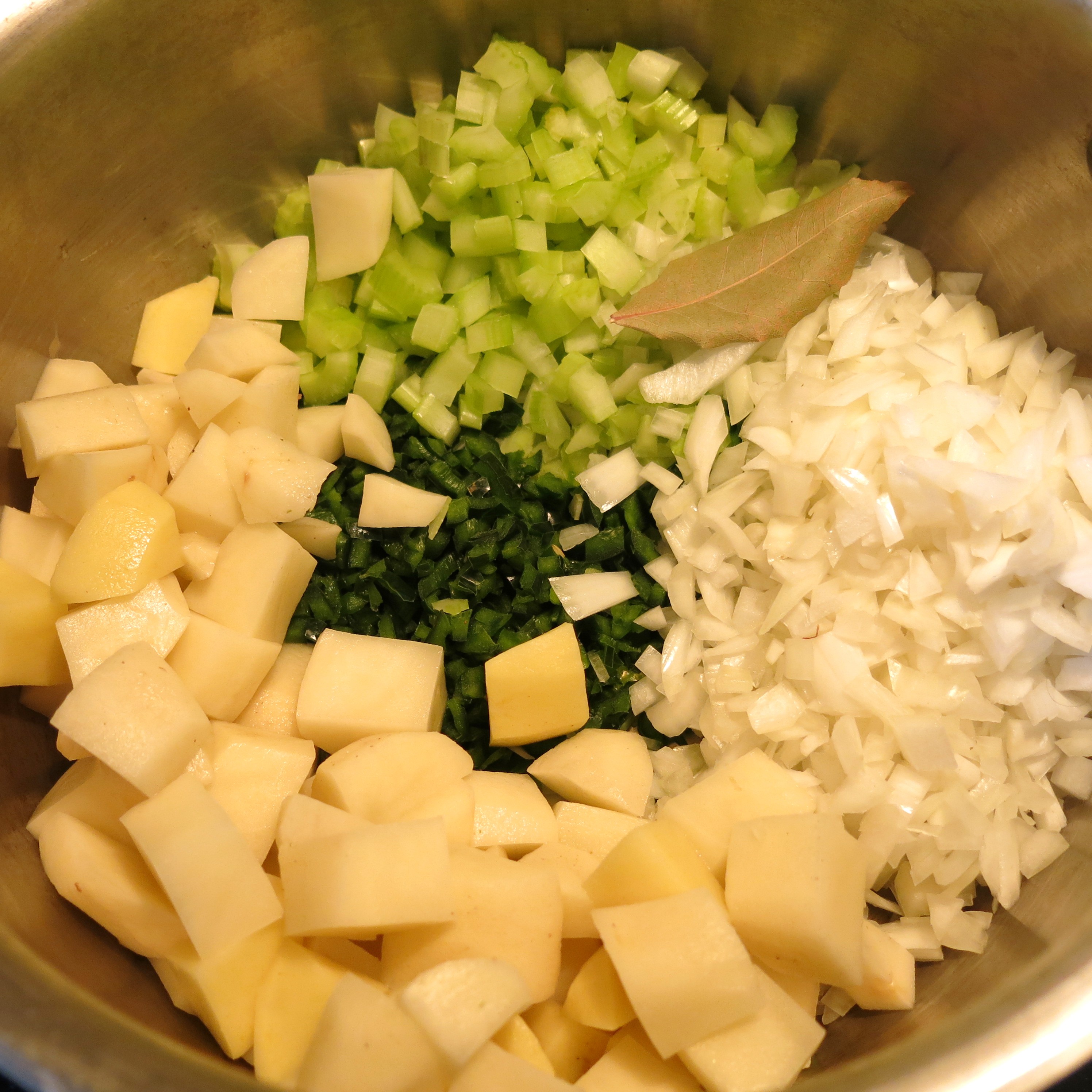The base of this soup consists of finely diced onions, celery, poblano chile (okay, that’s not so spring-y, but I had one and it need to be used…get over it!), potatoes,