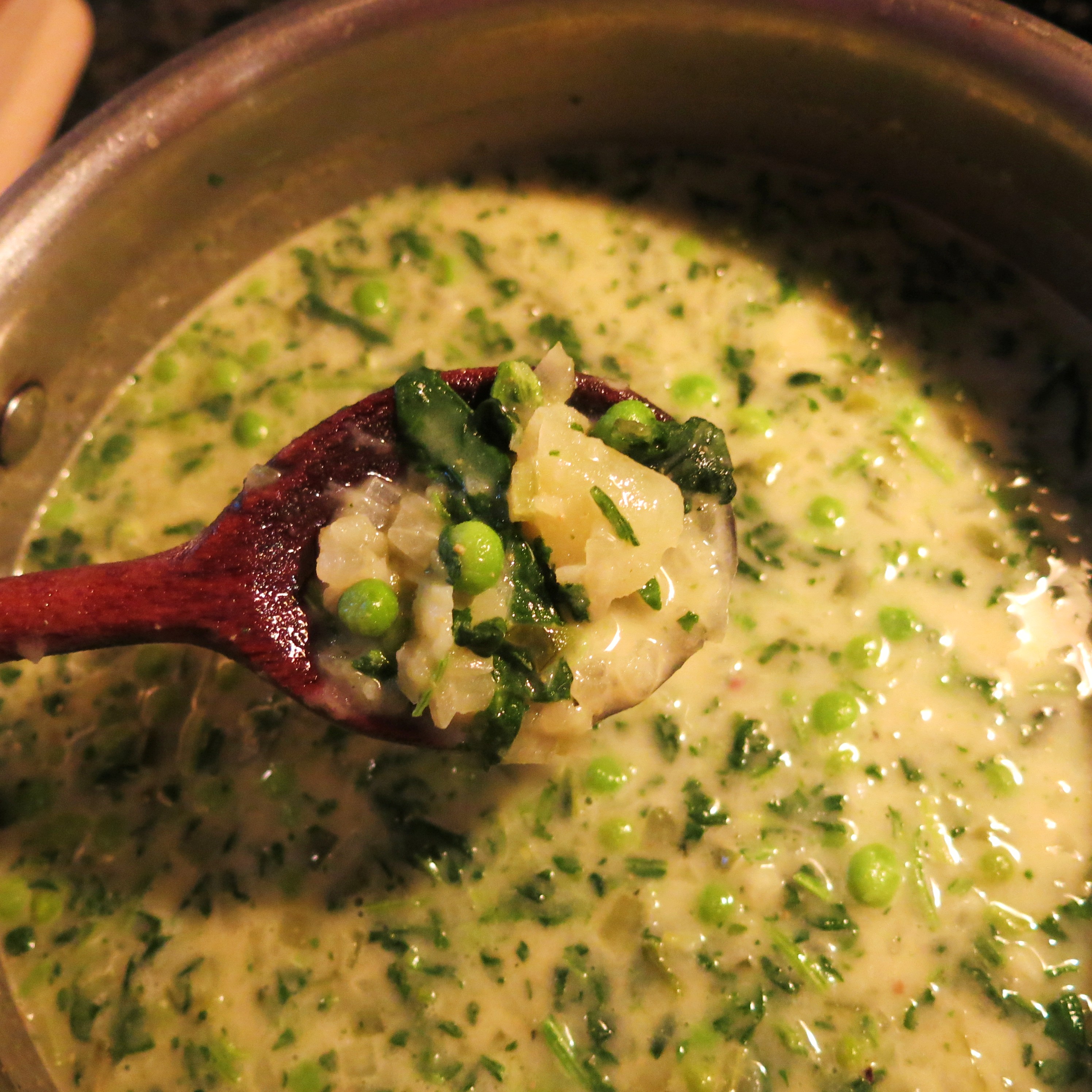 peas, spinach, broth, a touch of heavy cream, roasted garlic, salt, pepper and just a few grindings of nutmeg. If you feel the soup needs to be thicker, dehydrated potato flakes or cooked rice will do the trick!