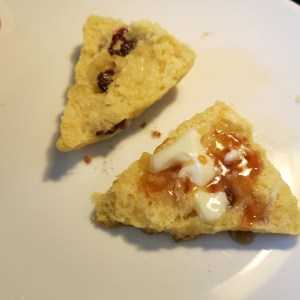 I’ve learned to make “discs” of butter, rather than pea-sized pieces. The discs seem to make a flakier biscuit; which is what scones really are. We’ll do biscuits another time….