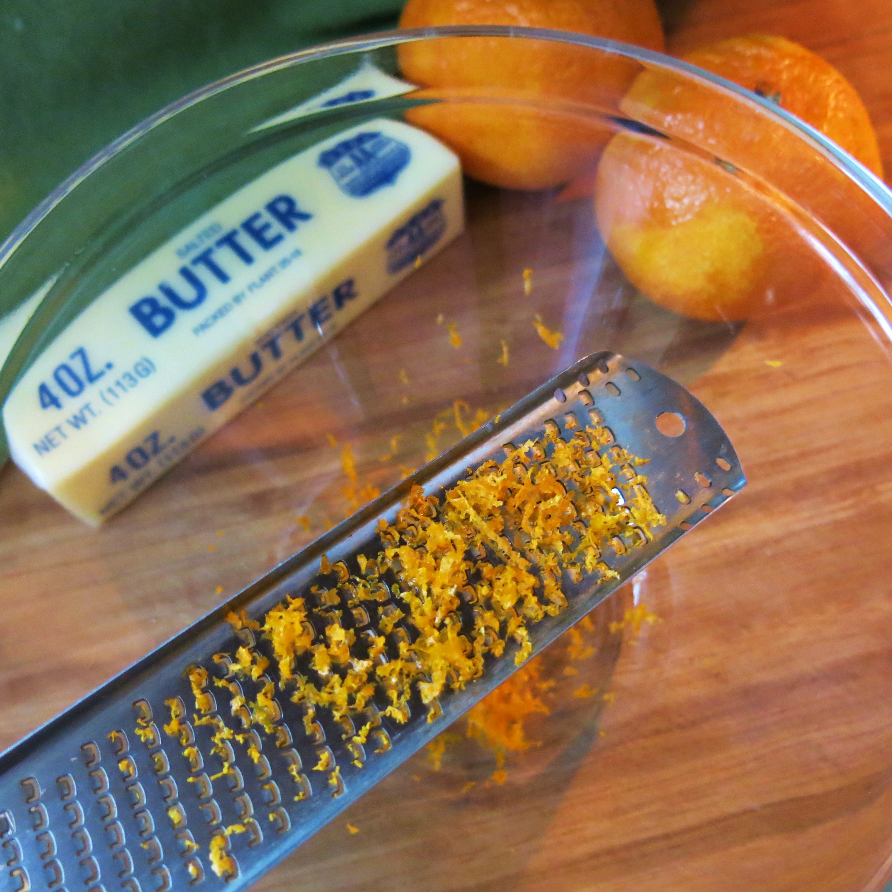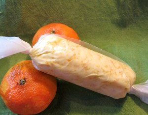 I made tangerine-ginger butter. It’s great with fish, shrimp, green beans, asparagus and not too shoddy with frozen peas. As you can see, I roll the softened butter in waxed paper, twist the ends, form into a log and chill. I find it’s easier to handle using waxed paper, while the butter is soft. After chilling, I transfer the log to plastic wrap.