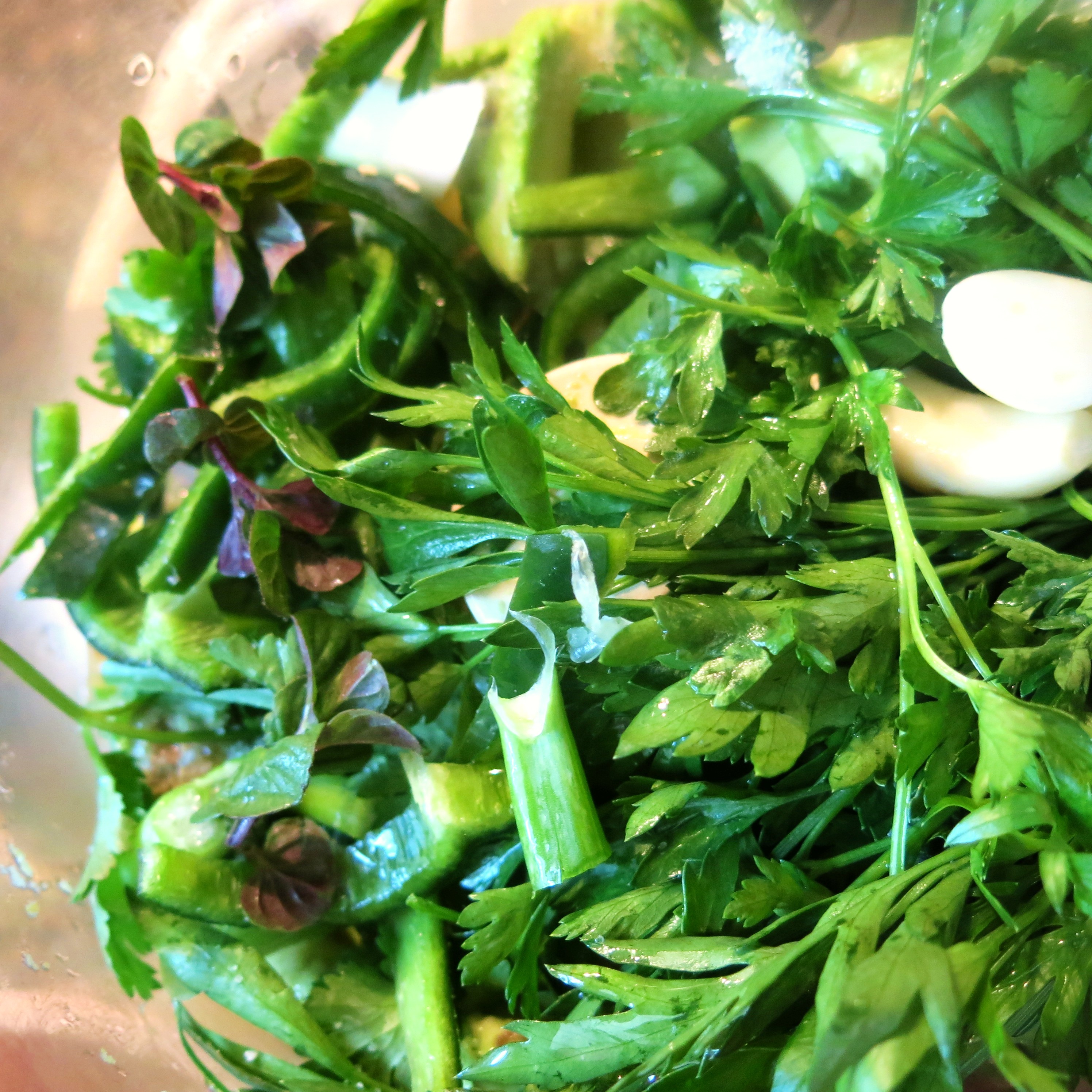 As I usually do, I changed the recipe just a bit. I change recipes either by choice or by need. In this case, I didn’t have a jalapeño in the house, so I used a poblano instead; I wasn’t looking for heat anyway. I used 2 avocados instead of 1 and added a couple of mint leaves to the mix, along with the parsley and cilantro. Pinch of Yum uses a combo of fresh parsley and cilantro leaves only.