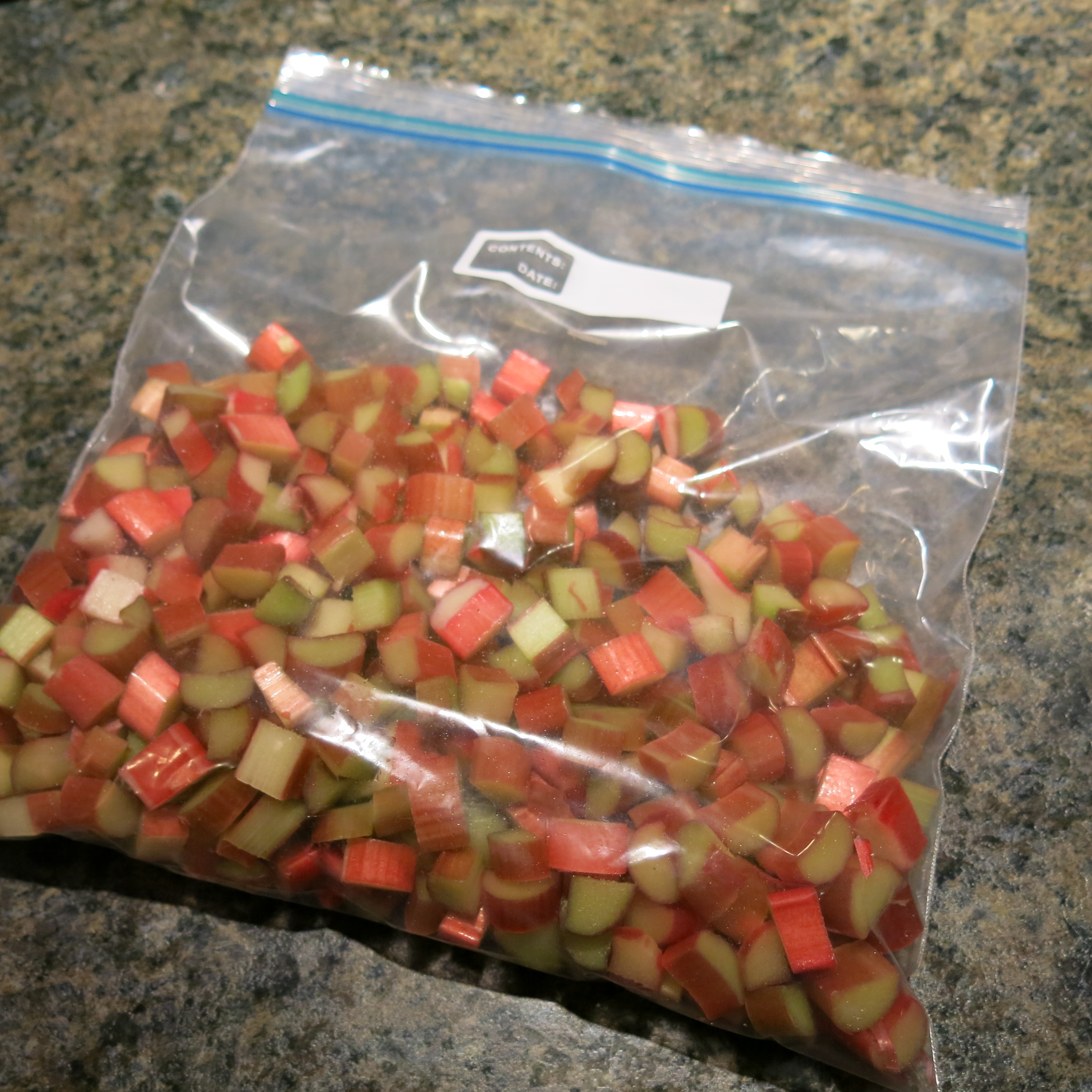 Rhubarb freezes extremely well, so you can indulge in a little taste of spring in the dead of winter. To freeze it, you simply cut it up, dump it into a Zip-Loc freezer bag, remove as much air as possible and put it in the freezer…done! So rhubarb is not only splendidly good, but it’s a memory for me and one that I indulge in at this time of the year, so you’ll have to bear with me.
