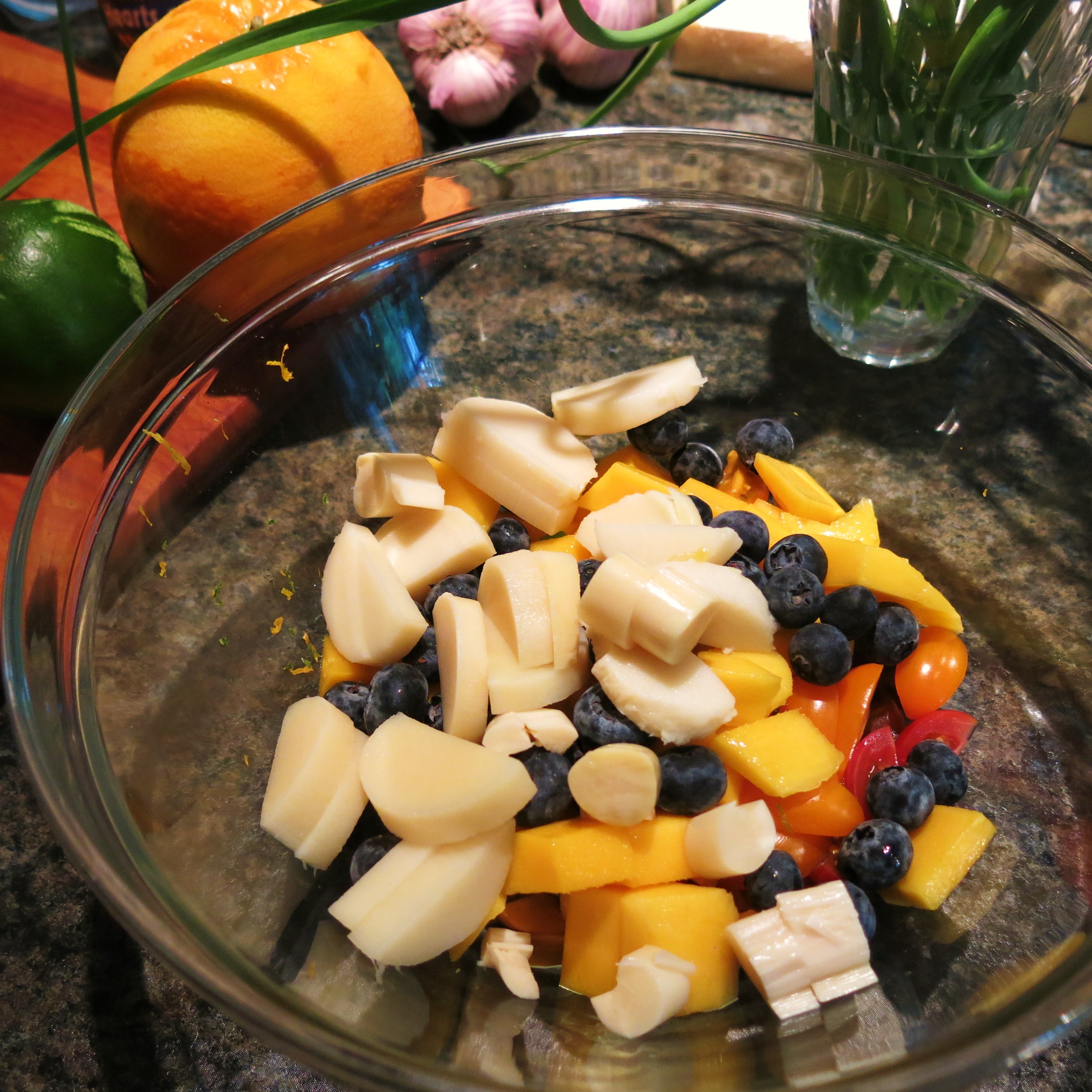 Hearts of palm are served everywhere in Brazil. They add a nice texture, and are rather bland so they won’t over-powdering the delicate shrimp and other flavors. Then there’s the orange and lime zest. Brazilian use both fruits with abandon…no wonder I loved living there so much! You can see the mango chunks under the hearts of palm and though not Brazilian at all, I added blueberries for both color and flavor and because I had some in the fridge!