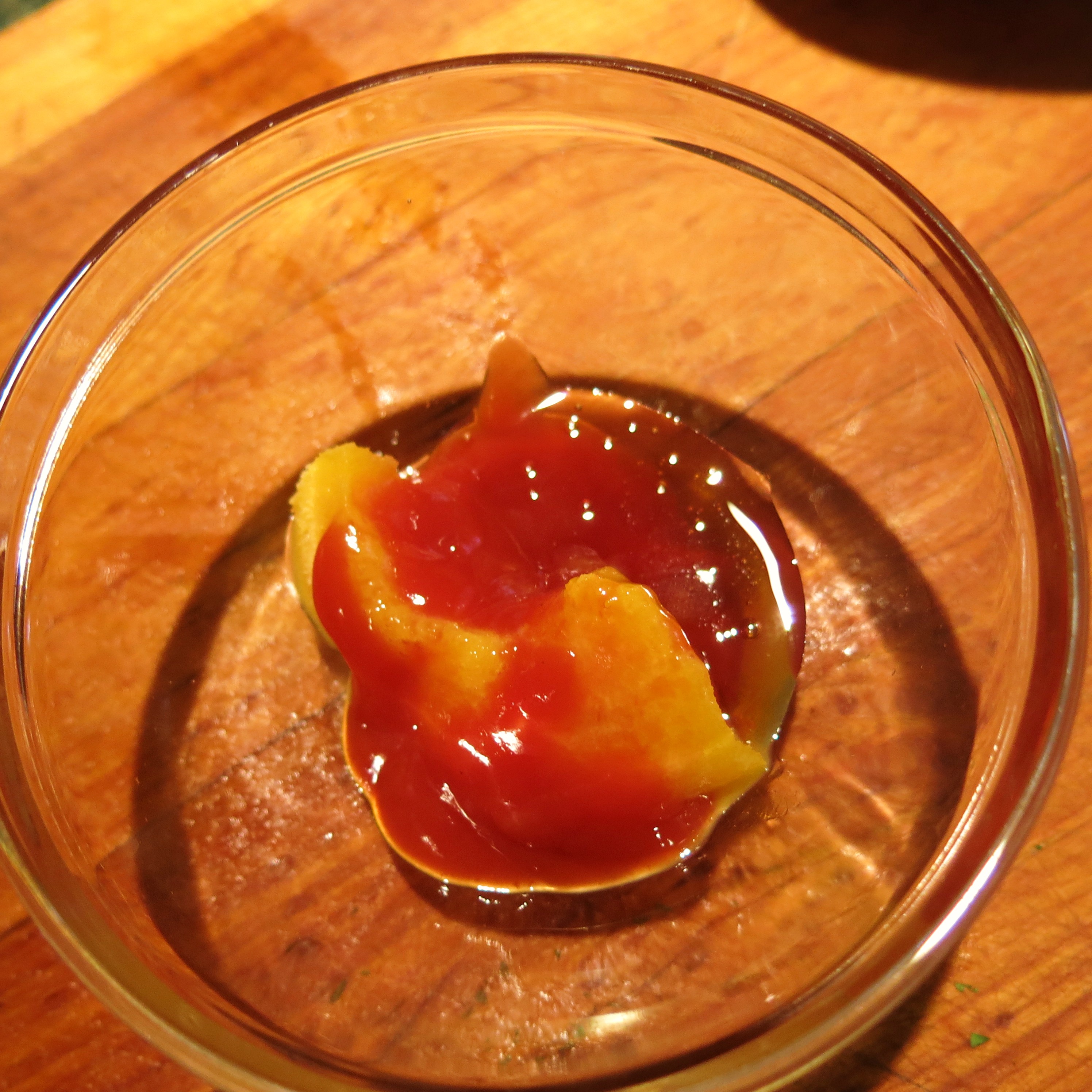 The vinaigrette is simplicity itself. I didn’t want to use oil because I didn’t think it was necessary for this. Sometimes even a wonderfully flavored olive oil can mask or dull delicate flavors. I wanted both the sweetness and tang from the ketchup and orange juice concentrate. The honey is a dark, deep flavored honey that is almost more savory than sweet. The nectar comes from Japanese knotweed and is from apiarists in Tolland, CT. You can purchase the dark honey, which isn’t particularly easy to find, at The Spice Mill. The recipe is for about 1 1/2 cups of dressing. You’ll only need 2-3 tablespoons for the recipe, but it’s a good dressing for a salad, to drizzle over steamed veggies or to use as a marinade.