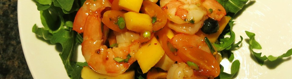 Given the season, I used garlic scapes in this. At other times of the year, I use a combination of minced chives, and chopped scallions, with about 2 finely shredded mint leaves thrown in. You can use basil, lemon verbena, or no herbs at all for this mixture, and it will still be outstanding. The Goddess had an after thought…ginger. Maybe about 1/2 teaspoon of very finely julienned fresh ginger might be nice with this. What do you think? If you choose to use fresh pineapple chunks, the ginger could be very nice. But, only use the fresh pineapple, if the entire salad will be eaten the same day, or the shrimp may get mushy. Pineapple contains the enzyme bromelain, which break down the protein fibers in the shrimp (or any protein, for that matter).
