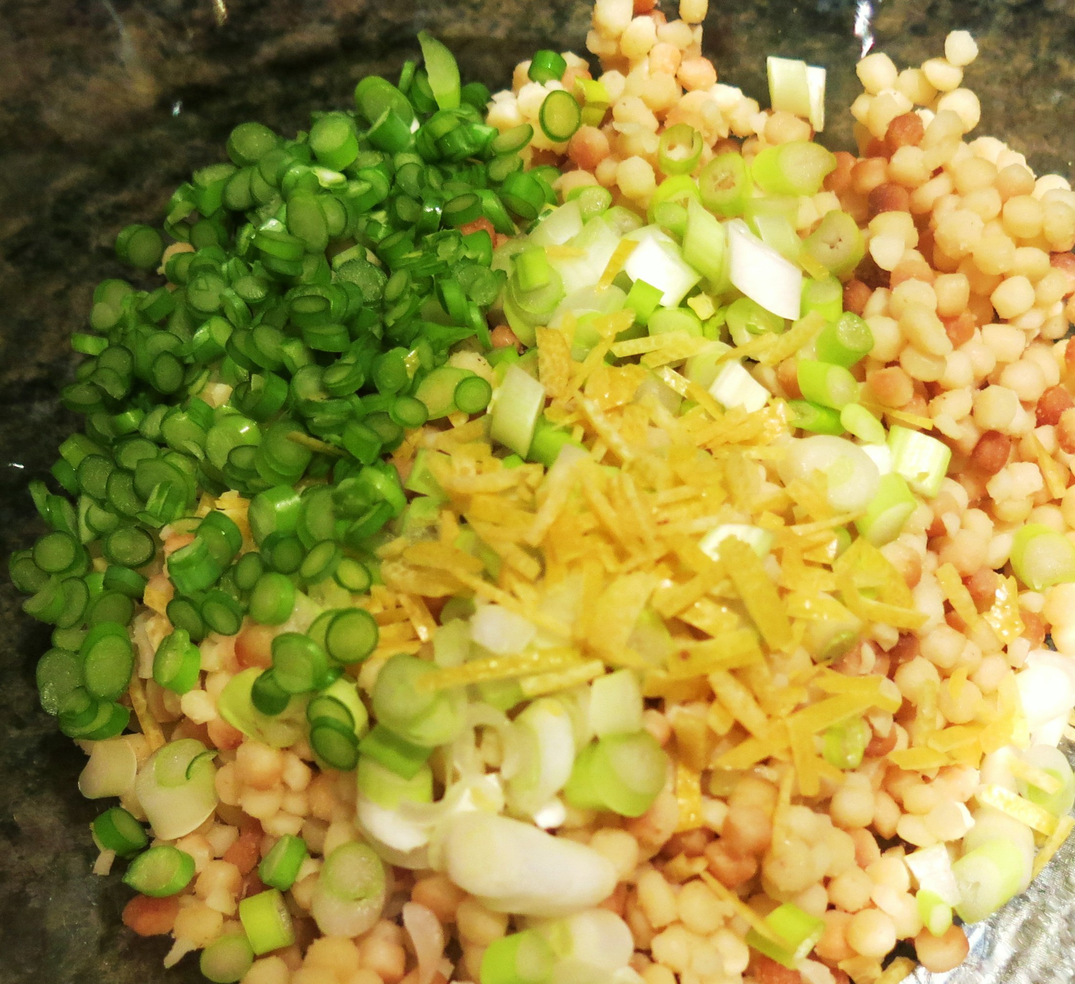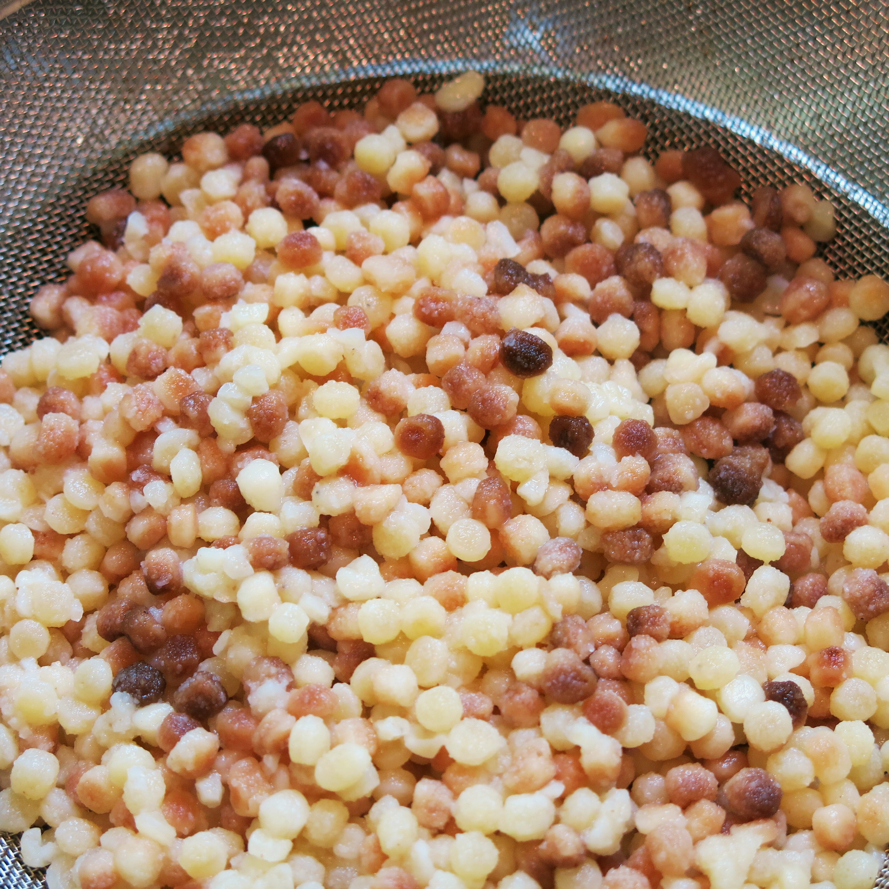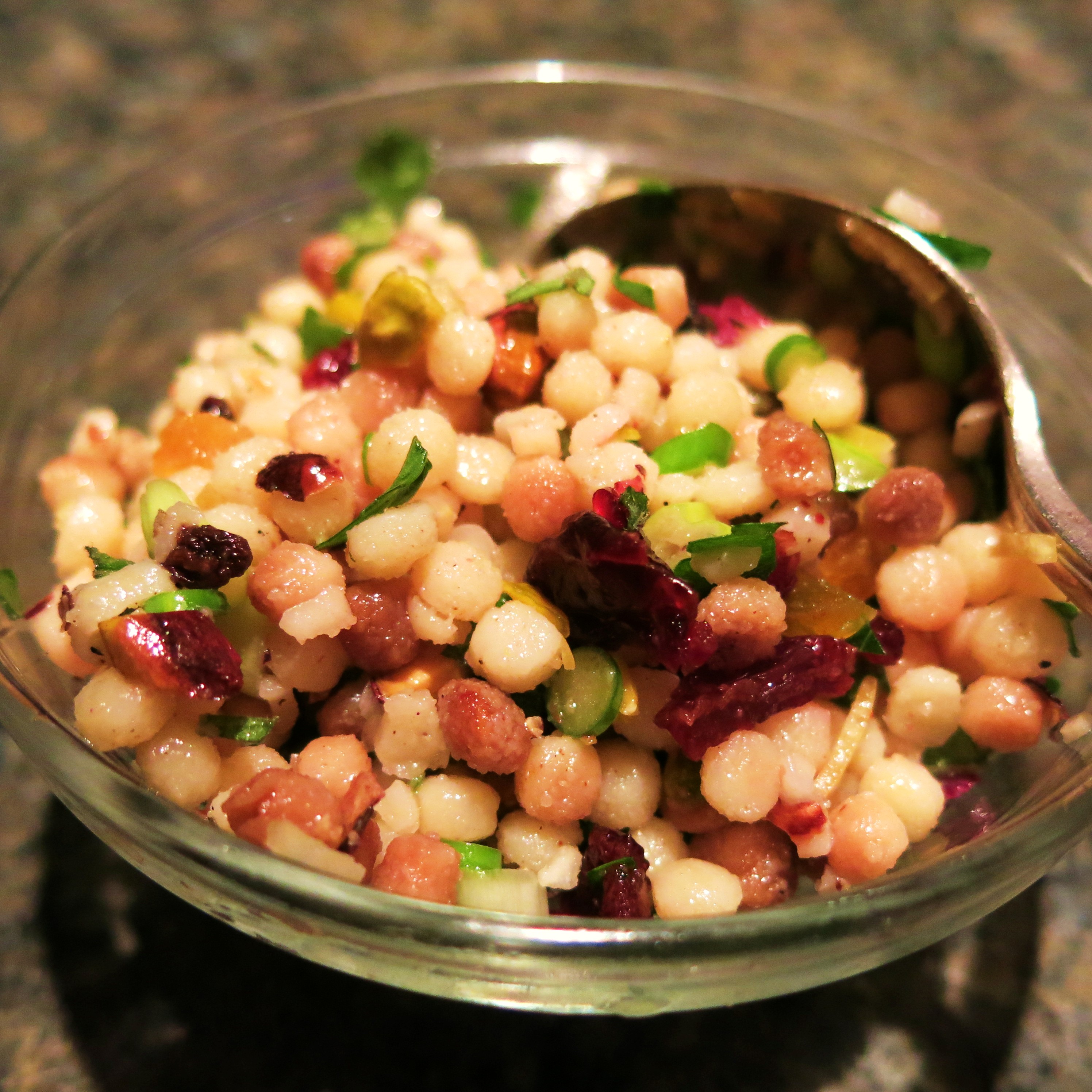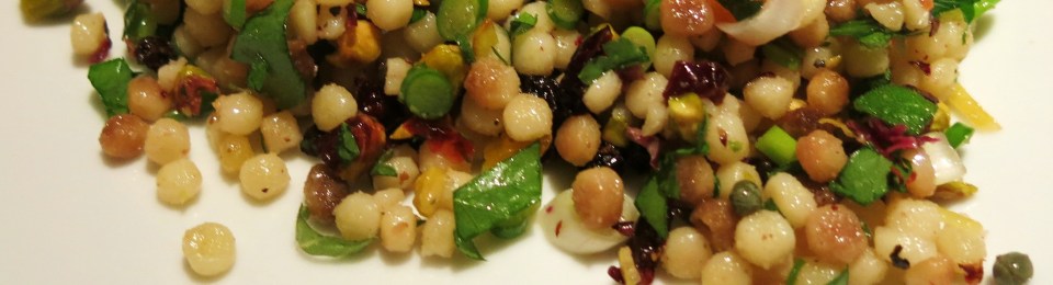 Apparently, she also loves alliteration. But, really who doesn’t? I have two words for you…fregola sarda. If you aren’t familiar with fregola sarda, get some and become familiar with it. It’s a southern Sardinian pasta, formed into little orbs similar to Israeli couscous, and then toasted. You can use Israeli couscous instead, but the fregola is just more interesting and has far more flavor. It is available in various sizes; I use a medium-sized orb for this mixture. The Sardinians typically simmer fregola in a tomato-based sauce with clams. It too, is gorgeous and gloriously good. Check out a recipe here and here, for Fregola con Vongole.