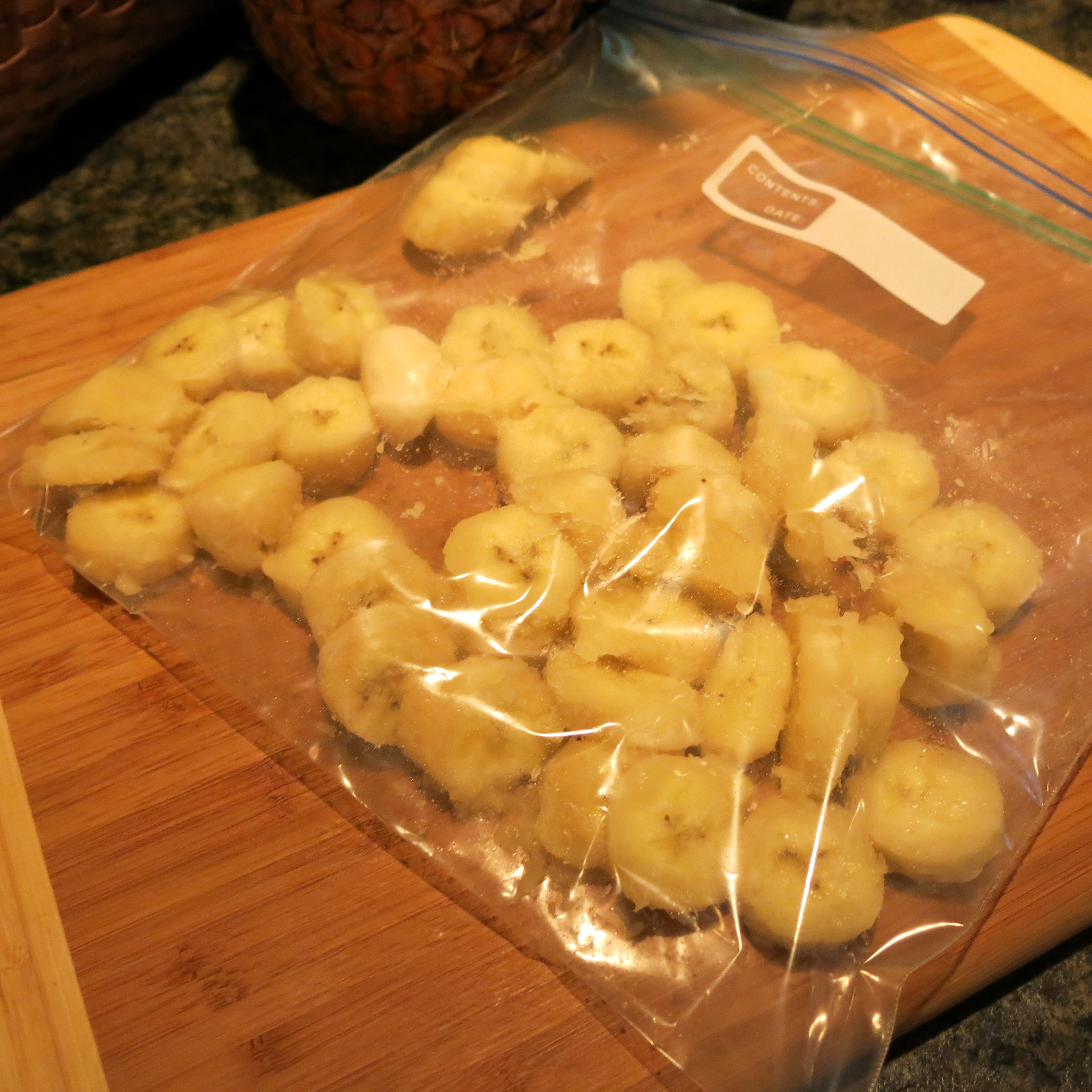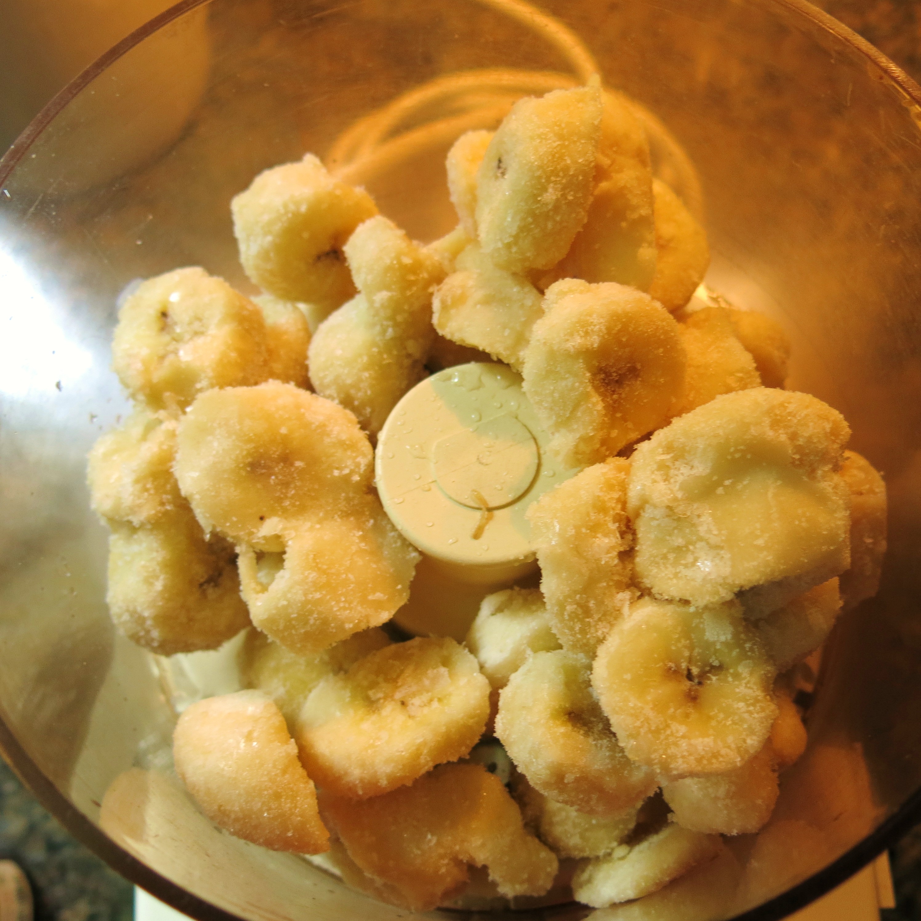 threw them in a plastic freezer bag and froze them for about 4 hours. Overnight is better, but The Goddess had places to be and she wanted to have this made and in the freezer. When the bananas are perfectly frozen nuggets,