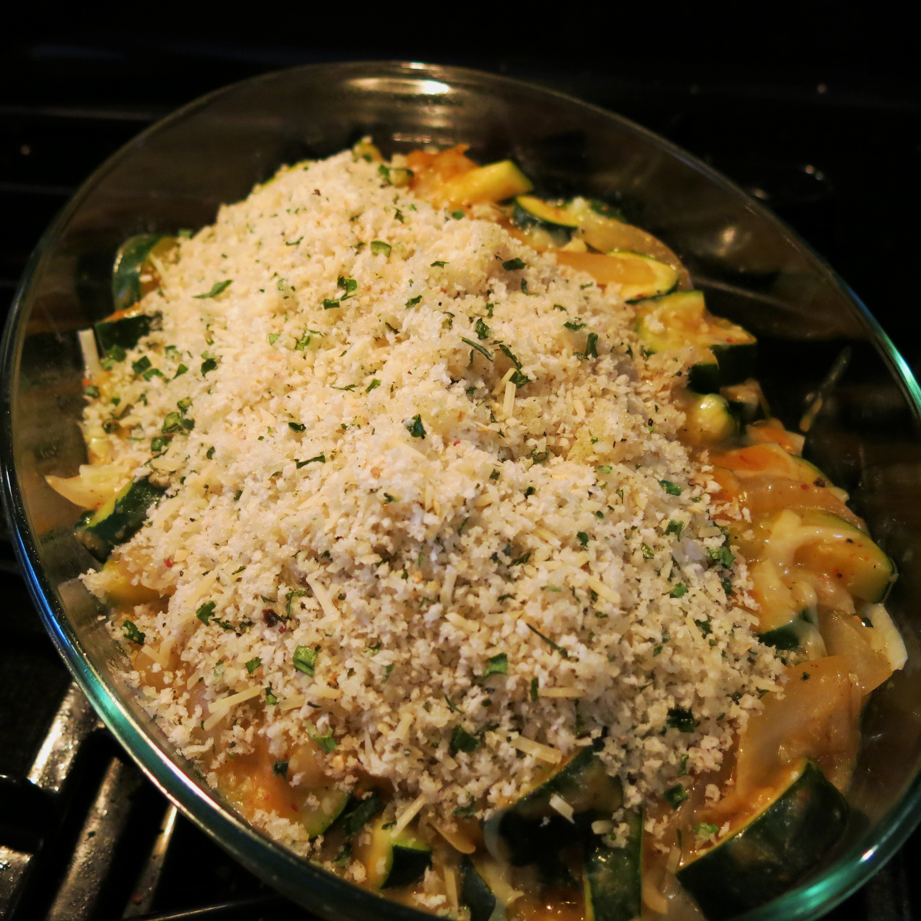Combine the bread crumbs, melted butter and parmesan; sprinkle on top of the zucchini mixture. Bake for 20 minutes, or until bubbly and browned.