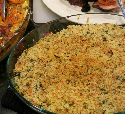 I layered the fennel/onion mixture with tomato slices, then topped it with heaps of shredded parmesan cheese, garlic, olive oil, and panko crumbs. Of course, I didn’t remember to take pictures of the finished dish…that would have just been way too organized.