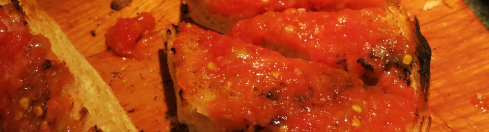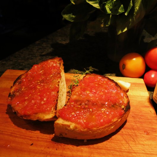 Today, when I got the first real vine-ripened tomatoes, I knew EXACTLY what to make. Tomaquet is to Spain, in particular, to the Catalan, what bruschetta is to the Italians. Ask any Spaniard about tomato bread and they will get a faraway look in their eyes and wax on about tomaquet for, at the very least, 15 minutes. Good tomatoes, good bread and great olive oil are taken for granted in Spain. Here we have to wait for the tomatoes, search for or make good bread and great olive oil, usually imported from Spain (or Italy, if you must!), needs to be sought out. But in Barcelona, this is on every tapas table and sometimes is on large platter in bars…in other words, it’s everywhere.