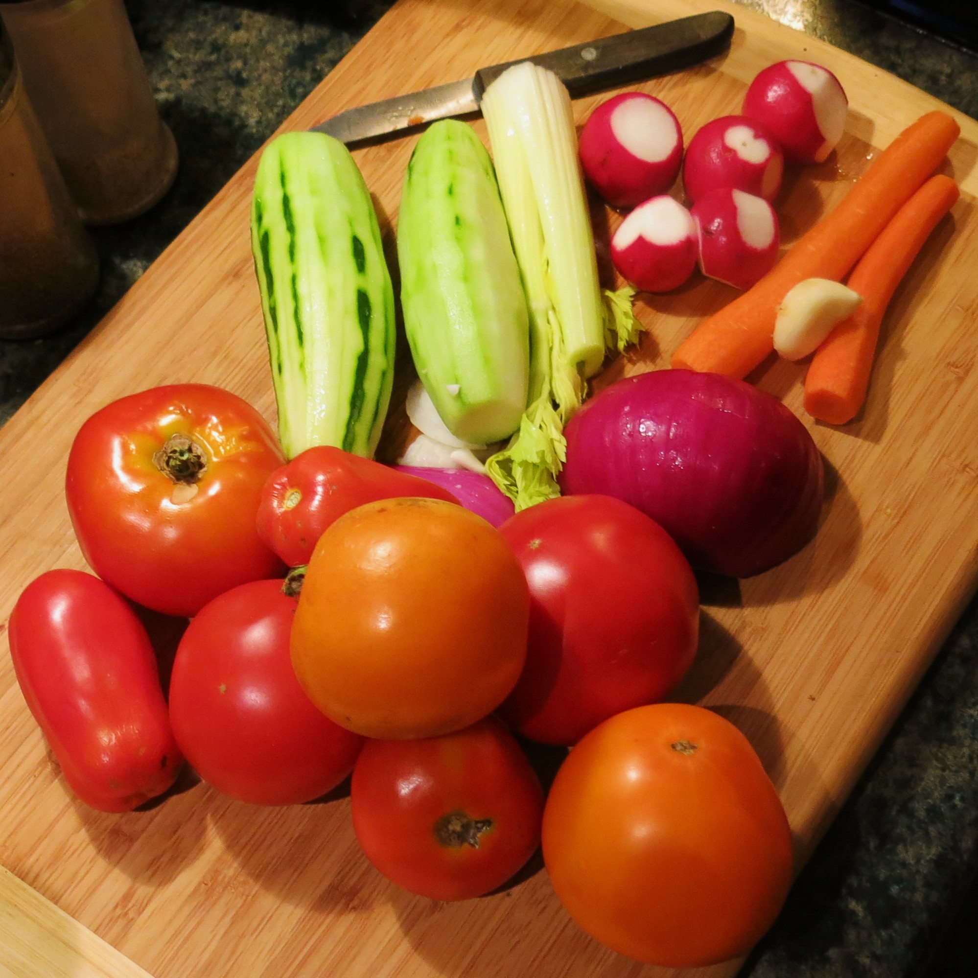 bell peppers, cucumber, Garlic, lemon juice, onion, radishes, sherry vinegar, Spices, tomato juice, Tomatoes, Vegetarian